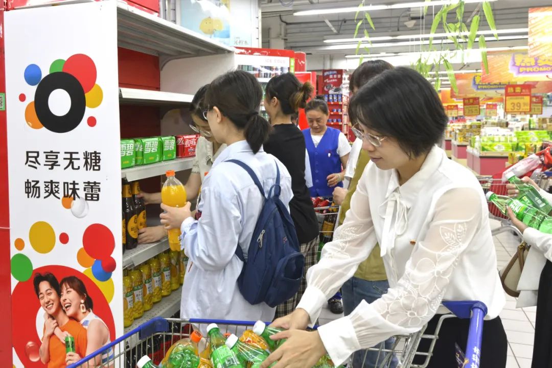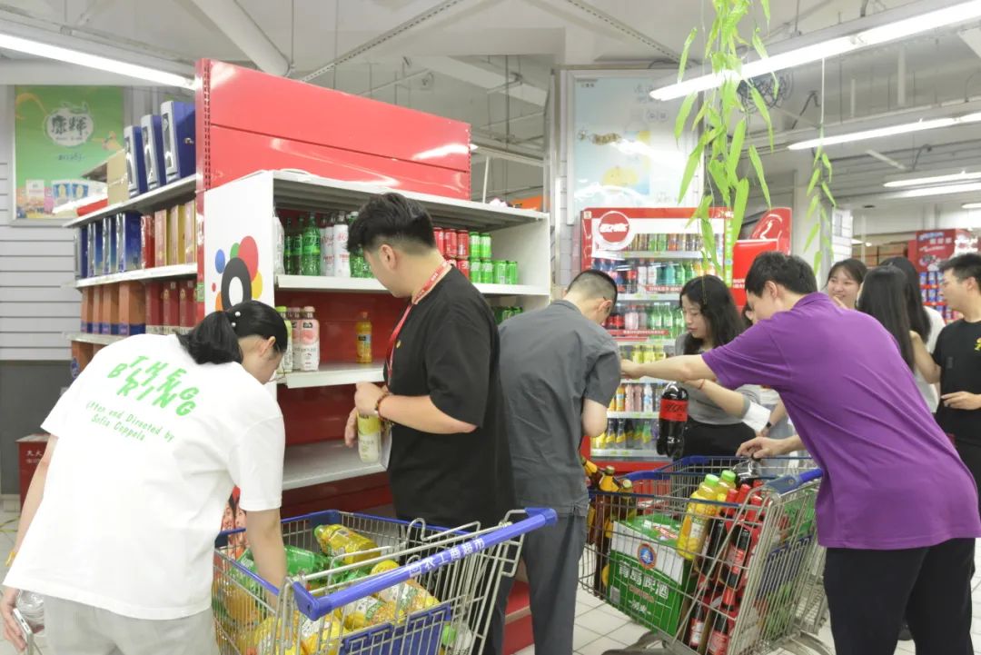 正值炎炎夏日,超市饮品区是消费者光顾的热门区域,团员青年们的任务是为门店打理出一个夏季饮品专柜。大家边商量边摆货,很快就把饮品整齐地摆满了货架。