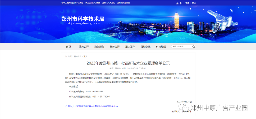 根据《高新技术企业认定管理办法》(国科发火〔2016〕32号)、《高新技术企业认定管理工作指引》(国科发火〔2016〕195号)及省市2023年度高新技术企业申报工作要求,现将2023年度第一批1595家高新技术企业受理名单(详见附件)予以公示,公示期自2023年7月24日至7月29日。公示期间若有异议请向郑州市科技局实名反映。