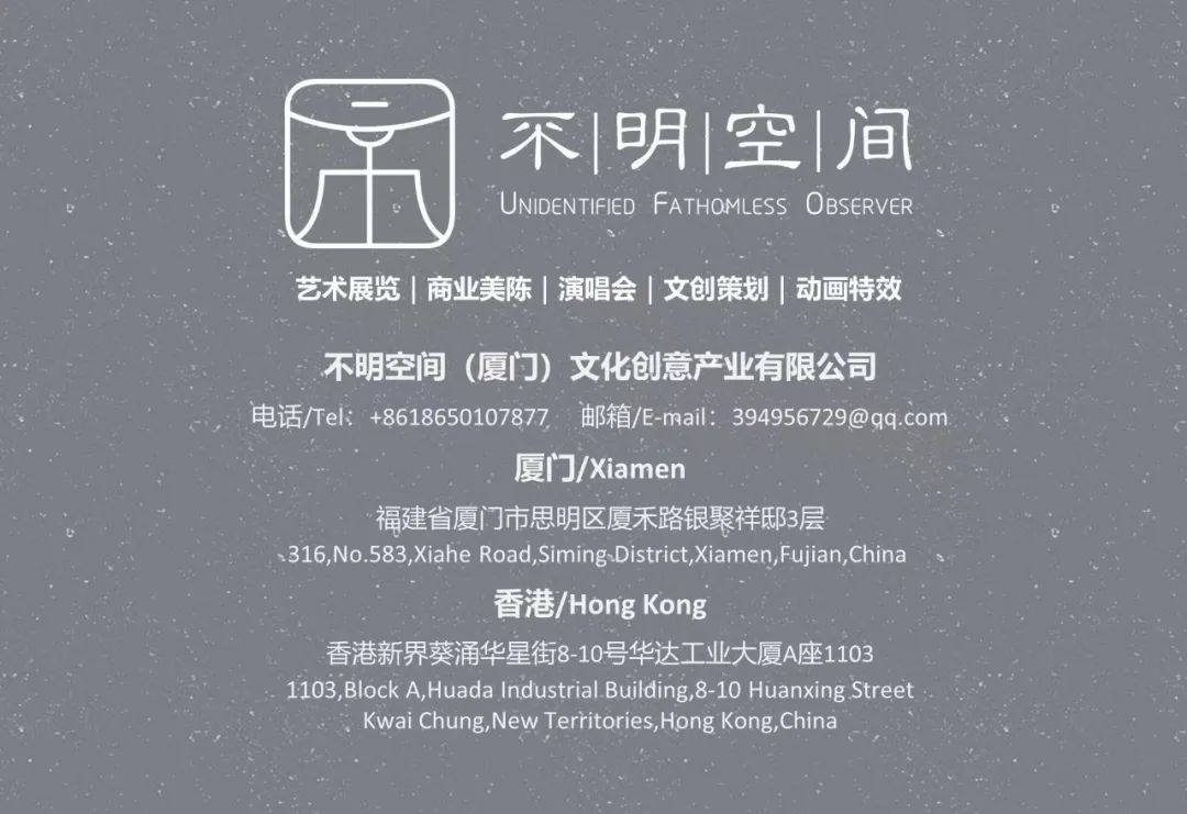 不明空间文创机构坐落在美丽的海滨城市厦门。不明空间集合多元化的优质资源,聚集多方面的创意与设计人才,联合国内外艺术、创意机构或个人,致力于推动行业“六化”建设,即商业文化化、形式创意化、内容定制化、场景可变化、效果可视化、服务标准化。团队核心成员均拥有多年综合类艺术展览、商业美陈、创意演出、文创项目等项目的策划或执行经验,以独到的创意视角为客户提供专业化的完整解决方案。
