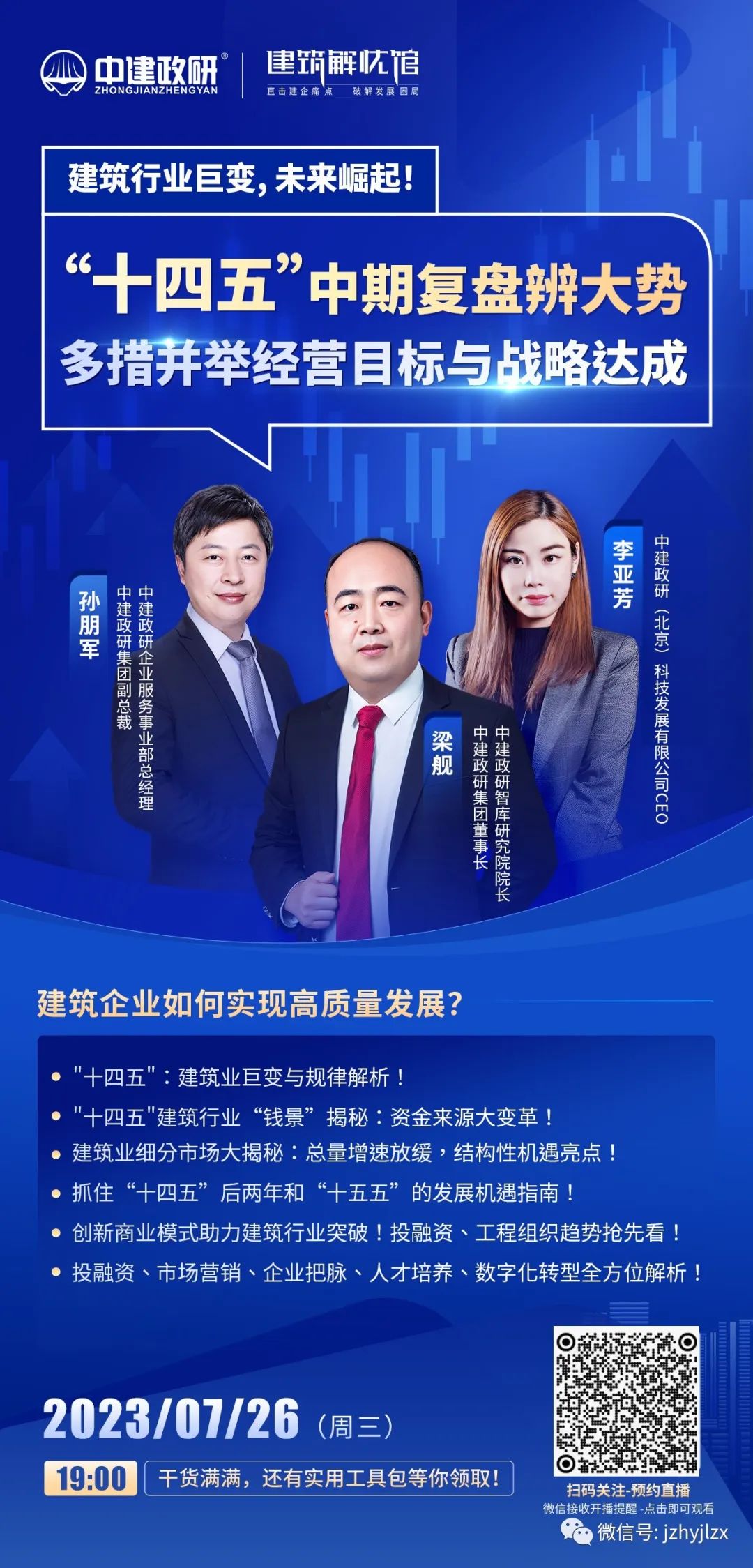 十四五”规划期间,建筑行业发生了哪些重大变化?“钱景”如何?在建筑业总量增速放缓的背景下,细分市场发展态势如何?有哪些结构性机会呢?7月26日晚7点《建筑解忧馆》特邀中建政研集团董事长梁舰、中建政研集团副总裁孙朋军、中建政研(北京)科技发展有限公司CEO李亚芳,就“十四五”规划下建筑行业发生的巨变,抢先洞察建筑业发展新趋势,多措并举实现经营目标与战略达成。直播期间将会共享三位嘉宾独家课件,福利多多,重磅干货内容不要错过!