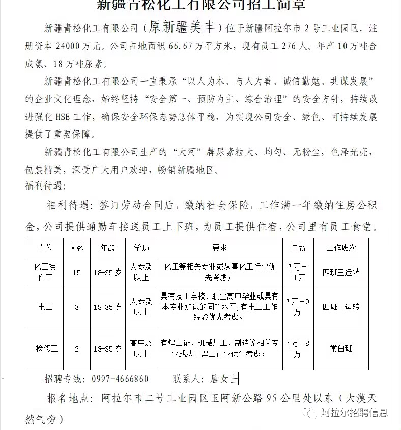 四、原料普工:工资5500+绩效,招聘1人招聘条件:25-45岁之间,身体健康,有相关岗位工作经验者优先、退伍军人优先、相关化工类学历者优,实习期1—3月,转正后缴纳社保,提供住宿 地址:新疆阿拉尔市第二工业园区。 导航:经二路青松化工电石车间(盛源热电后面,巨科加气块对面) 有意者可致电:17393131548微信同号 致电时间10:00—13:00,下午16:00—19:00