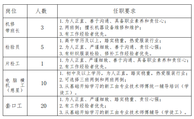 宁夏新中绒羊绒服装有限公司,是爵派尔集团为顺应未来国际国内业务发展需要,于2021年在宁夏新投资成立的一家针织企业。公司位于宁夏灵武市生态纺织园区内(原宁夏中银绒业针织板块C3),注册资金5000万元人民币,集研发设计、生产制造为一体,主要生产高品质男、女羊绒针织系列产品。公司与国际国内一流品牌商展开业务合作,致力于打造世界级的一流羊绒品质制造企业。因公司生产发展需要面向社会全面招聘,诚邀您的加入。