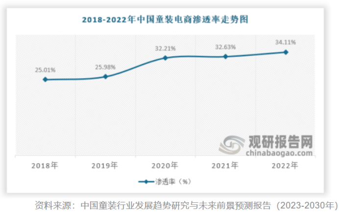 疫情下,消费者降低出行和聚集意愿,童装线上消费蓬勃发展。据《中国童装行业发展趋势研究与未来前景预测报告(2023-2030年)显示,我国童装电商渗透率从2018年的25.01%增长至2022年的34.11%。童装在线上渠道之所以快速发展原因,一是相较成人服装而言,童装购买者与使用者分离,标准化程度高,试穿要求较低,时尚属性偏弱,比较适合线上销售。二是线上产品种类丰富,还具有价格优势,可货比三家。