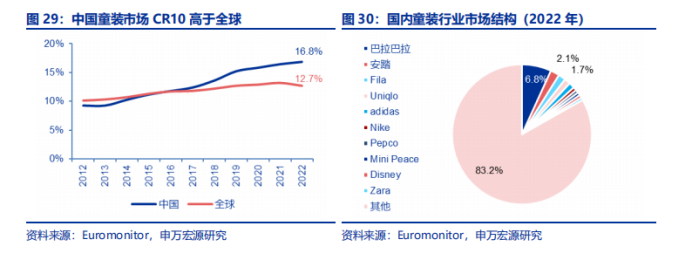 先看一下品牌竞争格局,2022年前十大童装品牌合计市占率为 16.8%,其他品牌合计占比高达 83.2%。目前,国内童装市场没有一家品牌市占率超过10%,行业分散,小品牌众多,高端以海外奢侈品牌为主,中高端以海外运动品牌、国内品牌为主,大众品牌为行业主流趋势。据Euromonitor(欧睿国际)统计,森马服饰旗下巴拉巴拉稳居行业头名,2022 年市占率为 6.8%,领先其他品牌。安踏位列第二,2022 年市场份额为 2.1%,其次Fila、优衣库、阿迪达斯、耐克等企业依次排列。