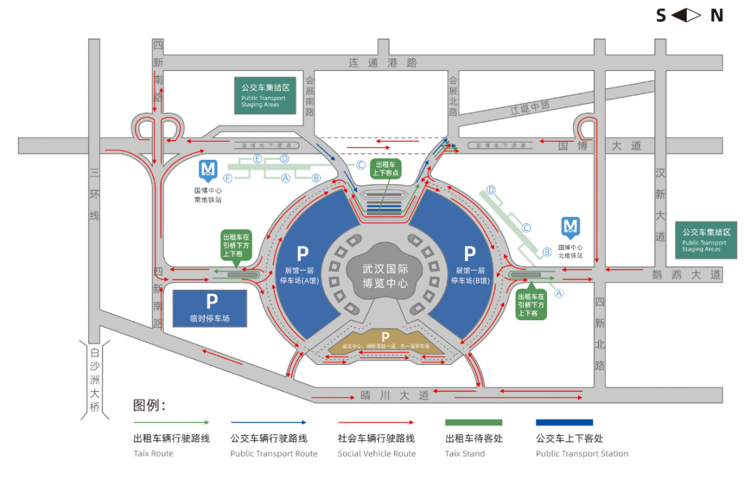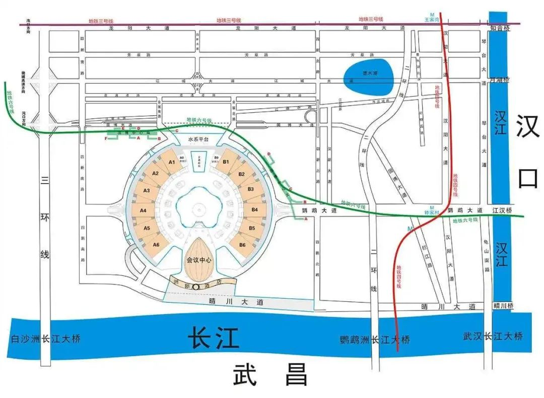 路线四:三环线---江城大道---四新北路---鹦鹉大道,经主通道进入B馆二层货运通道---至A馆二层货运通道,离开时原路返回。