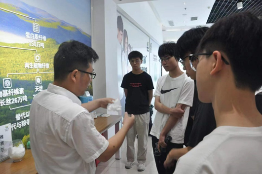 在丝丽雅集团有关部门经理陈印的带领下,实践团首先参观了丝丽雅集团的科技展厅。参观过程中实践团成员从丝丽雅的发展历史、主营业务和企业文化等方面详细了解集团本身。通过陈经理的介绍,成员们了解到丝丽雅近年来丰硕的创新成果。从为提高生产效率的一锭多丝技术,到为解决原料需要高价进口且不稳定的情况研发k浆、回收浆、竹浆等技术,再到为保护环境研发的以可高度回收的溶剂化技术代替凝胶技术的莱赛尔纤维,这些丰富的科技创新成果,推动着丝丽雅集团成为地区纺织产业“领头羊”。