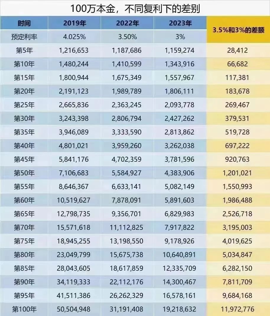 我们来看下不同年份下,100万本金,3.5%和3.0%的差距,看看现在买和以后买差多少钱?可以看到,100万本金