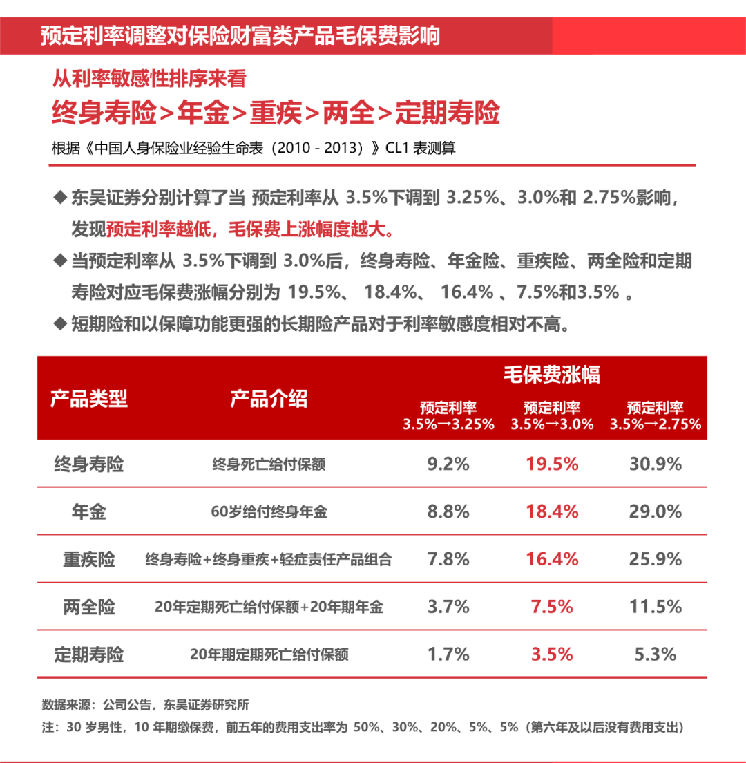 根据东吴证券的报告,如果预定利率从3.5%下降至3.0%,各种保险产品的差的可不只是0.5%!以30岁男性为例,买同样的保额;