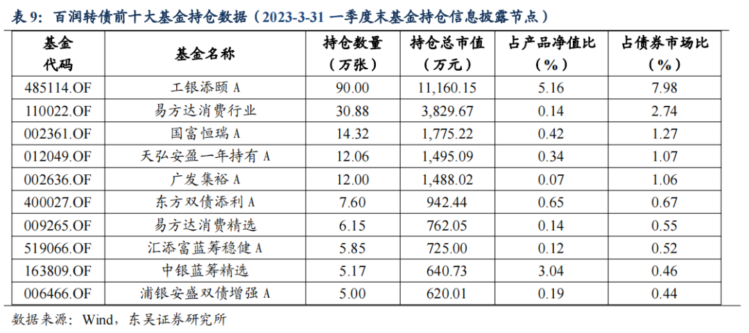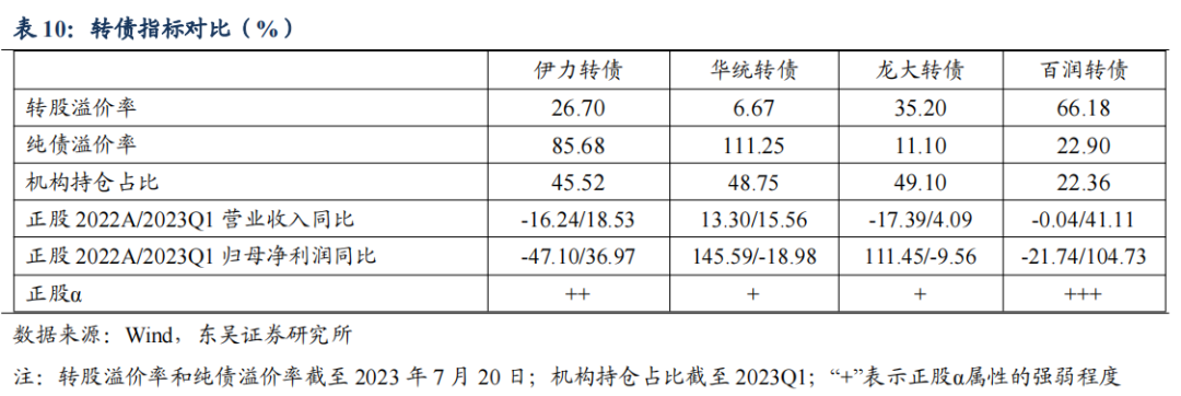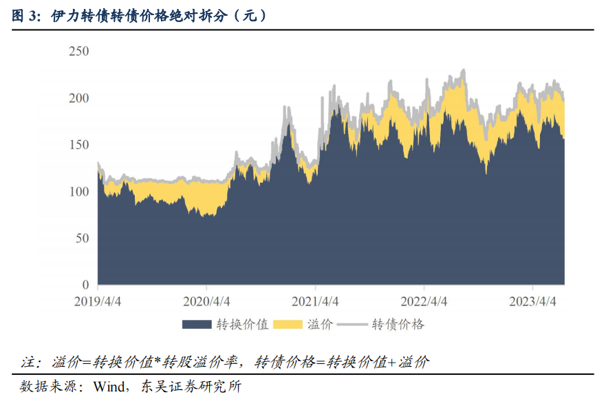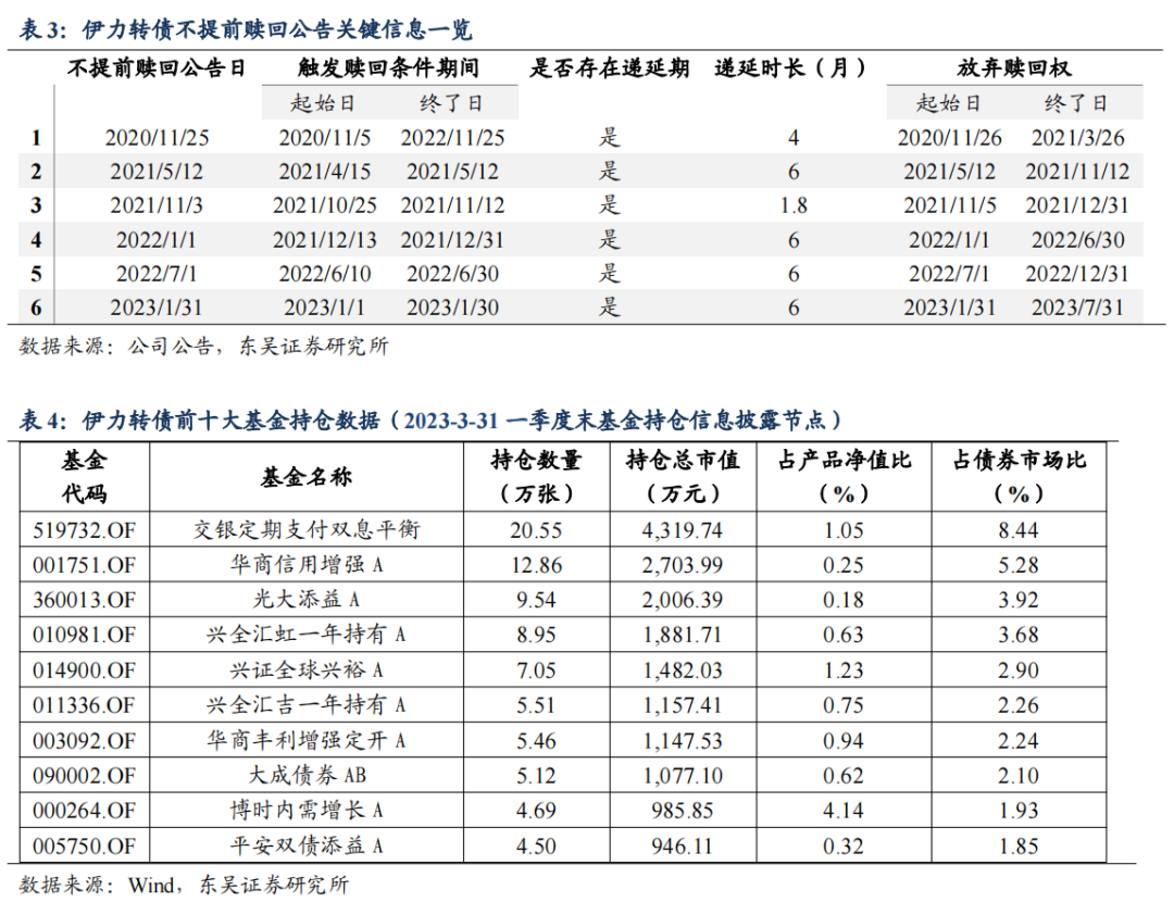 截至2023年7月20日,伊力转债的转股溢价率为26.70%,纯债溢价率为85.68%,为“偏股性”标的,转债价格与正股关联性强。条款博弈方面,伊力转债于2023年1月31日发布不提前赎回的公告,并宣布在未来六个月内(即2023年1月31日至2023年7月31日),如再次触发赎回条款亦不提出赎回方案。我们认为未来再触发赎回条件,公司仍然倾向于不行使赎回权力。伊力转债已于2023年3月15日进入回售期,截至7月6日,公司公告称72.21%的可转债已经转股,同时募集资金已严格按照募集说明书中项目规范使用完毕。伊力转债已大部分转股,即使不强赎也无需归还过多本金,有序转股是更好的选择。机构持仓方面,截至 2023 年一季度,机构持仓 2.33亿元,较去年四季度环比上升 100.83%,占伊力转债存续市值的 45.52%,关注度大幅回升。