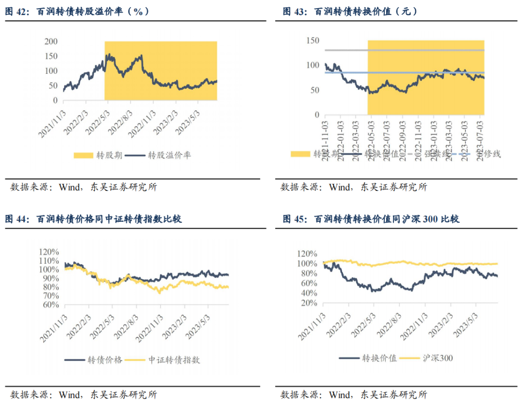 条款博弈方面,伊力转债和华统转债都已超过强赎线,持续达到强赎要求,但均连续发布不提前强赎公告,目前处于递延强赎期间。我们认为锁定期后,两家公司仍会维持递延强赎的状态。伊力转债已经进入回售期,目前已有大部分可转债已转股,公司倾向于等待投资者自然转股。华统转债2023Q2业绩承压,贸然强赎会增加资金压力,并且离回售期还有一年,因此两家公司强赎风险可控。龙大转债于2023年7月6日公布不下修公告,因为离回售还有一年时间,暂无回售压力,可等待正股回升。百润转债虽在下修线以下运行,但未公布不下修公告,我们认为公司更倾向于正股带动转债价格上涨。同时两家公司财务压力小,公司财务费用率以及转债目前计息周期内的票面利率均不高。