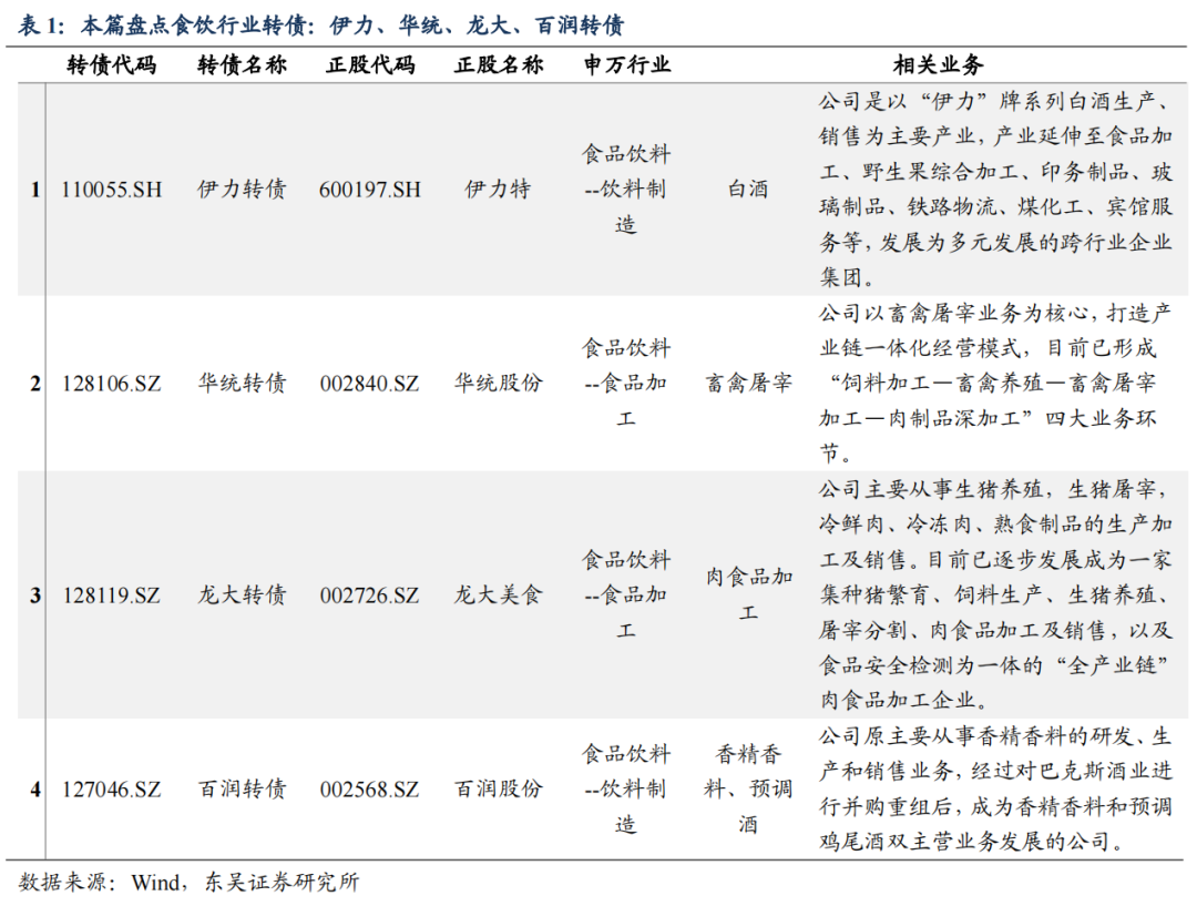 本篇作为转债行业图谱系列(十二),盘点食饮行业的相关标的,包括伊力、华统、龙大、百润转债。