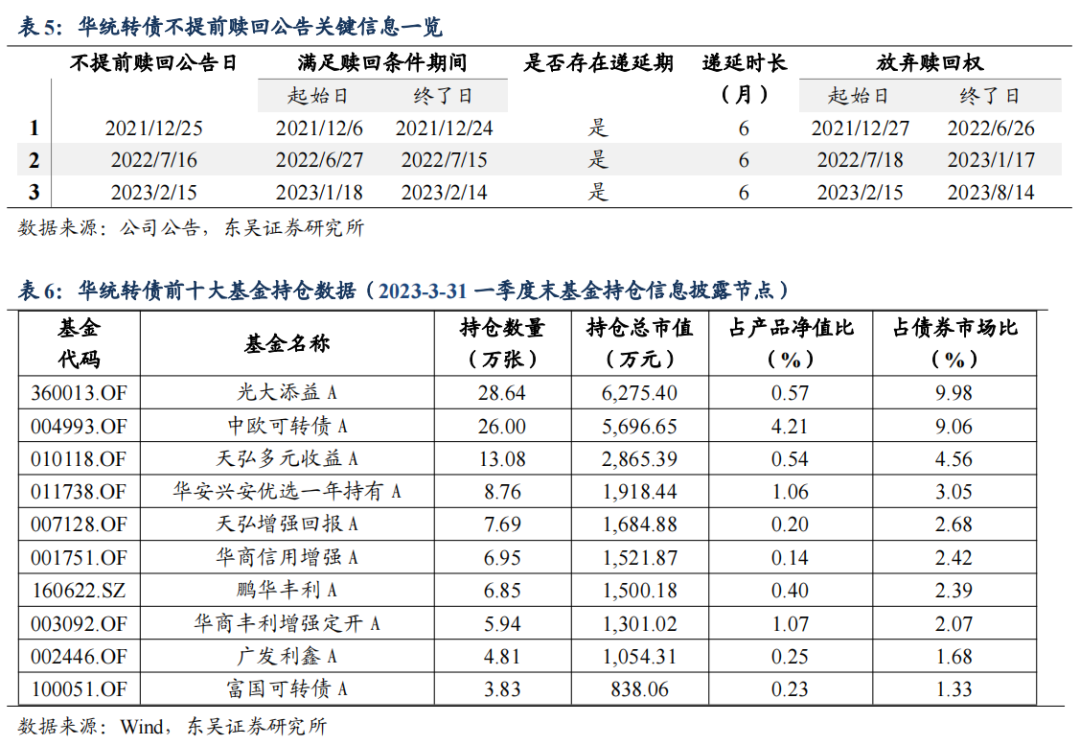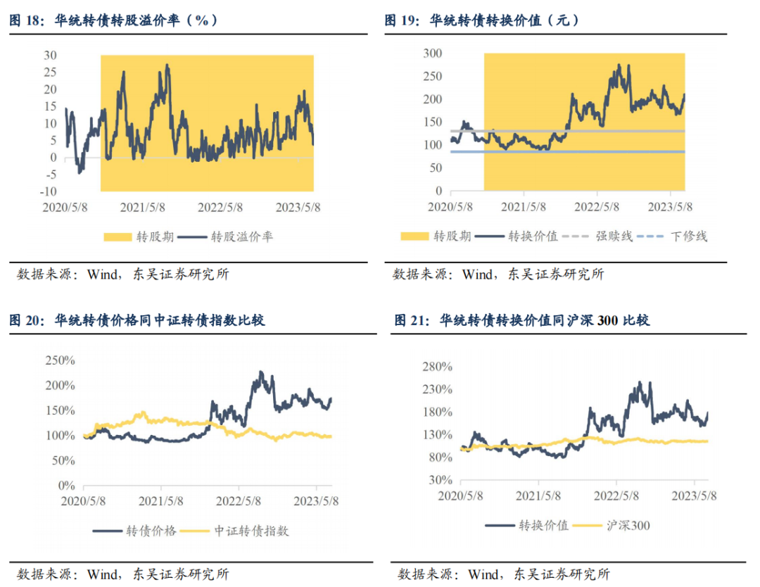 截至2023年7月20日,华统转债的转股溢价率为6.67%,纯债溢价率为111.25%,为“偏股性”标的。条款博弈方面,华统转债于2023年2月15日发布不提前赎回的公告,并宣布在未来六个月内(即2023年2月15日至2023年8月14日),如再次触发赎回条款亦不提出赎回方案。受益于2022年以来正股的持续上涨,华统转债三次触发强赎条件,转换价值高于强赎线的状态已经保持一年半。华统转债即将结束“锁定期”,我们认为未来“锁定期”结束后发行人仍倾向不提前强赎:(1)根据公司发布的2023年半年度业绩预告,公司净利润预计亏损3-3.6亿元,经营性现金流量为2.1亿元,目前华统转债的存续规模为6.29亿,贸然强赎会增加公司的现金压力;(2)正股价格不稳定,波动幅度较大,强赎有可能大规模转股冲击股价,因此发行人倾向于保持现金流稳定股东和股价。机构持仓方面,截至 2023 年一季度,机构持仓 3.06亿,较去年四季度环比上升 42.13%,占华统转债存续市值的 48.75%,关注度有所回升。