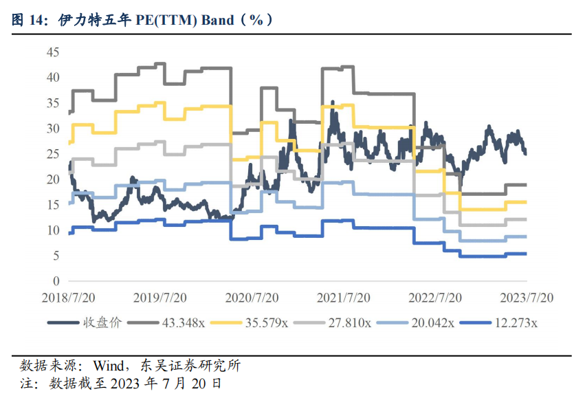 正股伊力特(600197.SH)作为“新疆第一酒”,以白酒生产、销售为主要产业,是浓香型白酒企业的典型代表。公司2022年实现营收16.23亿元,同比下降16.24%;实现归母净利润1.65亿元,同比下降47.10%,主要因为2022年下半年新疆出现大范围疫情,公司生产销售受阻。公司2023Q1实现营收7.40亿元,同比增加18.53%;实现归母净利润1.48亿元,同比增加36.97%。伊力特的主营业务产品为白酒,可分为高档酒、中档酒和低档酒,2022年营业收入占比分别为61.58%、31.10% 和5.54%,毛利率分别为5.70%、2.11% 和 -0.03%。截至2023年7月20日,公司 PE(TTM)为 57.46X,位于 2018年以来86.97% 分位数。公司目前存在三大发展方向:(1)公司有望享受新疆经济发展和文旅消费的红利。2022年新疆政府将重点转向发展经济建设,目前招商引资成效显著,伊力特有望吸引省内外优质经销商。同时新疆即将进入旅游高峰季,带动餐饮、酒店等旅游消费产业链升温。在消费复苏和经济建设的背景下,公司作为白酒龙头有望享受发展红利。(2)公司内部改革发展,在产品、渠道等多方面发力。产品方面,2021年收归伊力王酒并组建自营团队,着重发力次高端价格带,完善产品结构;渠道方面,过去的包销制转为“经销商+直销+线上销售”,推动渠道扁平化运作。(3)疆内外同时布局新市场。疆内布局南疆市场,设立南疆销售公司。南疆人口密度高,基数大,目前公司在南疆市场相对空白,未来有望贡献增量。公司近年来积极布局疆外市场,通过“浙江大商、品牌运营公司、电商公司”三方共同发力,未来加速全国化进程。展望2023年,白酒行业韧性十足,公司基本面持续向好,同时排除疫情的短期扰动因素,公司有望实现2023年低基数反弹,实现稳健增长。