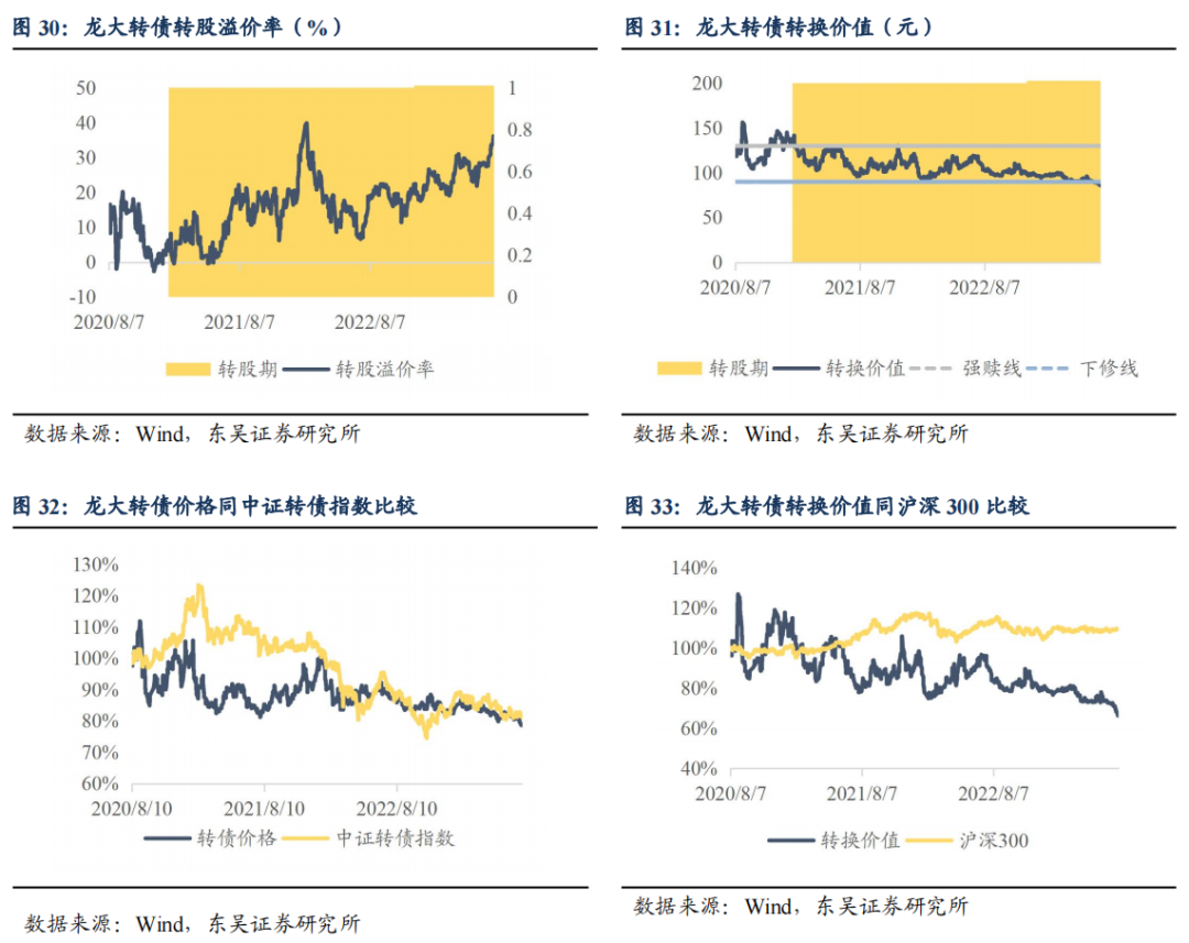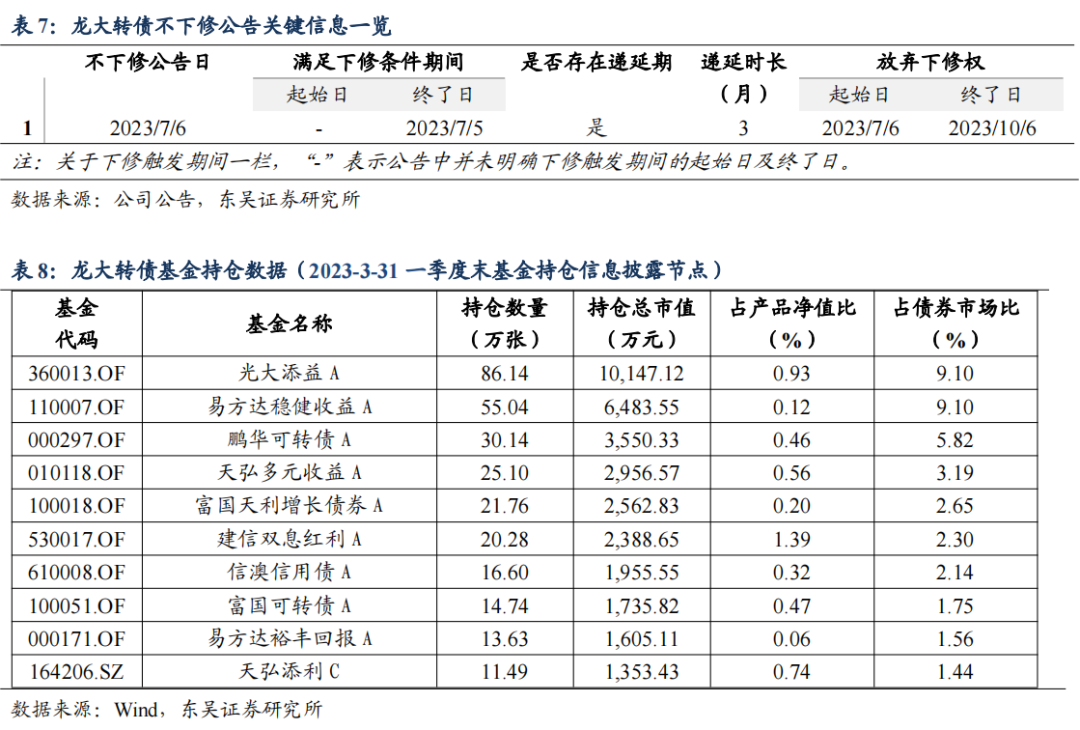 截至2023年7月20日,龙大转债的转股溢价率为35.20%,纯债溢价率为11.10%,为“偏债性”标的。龙大转债的转换价值近一年来逐渐趋于下修线,发行人于2023年7月6日公告不下修,并宣布在未来三个月内(即2023年7月6日至2023年10月6日)均不下修。我们认为龙大转债倾向不下修有以下两个原因:(1)龙大转债回售起始日为2024年7月13日,距今仍有一年时间,暂无回售压力,发行人可等待正股价格回升;(2)在当前的计息周期内,公司财务费用小,2023年财务费用仅为7.5%,龙大转债的票面利率仅为1.5%。机构持仓方面,截至2023年一季度,机构持仓5.47亿元, 较去年四季度下降11.96%,占龙大转债存续市值的49.10%。