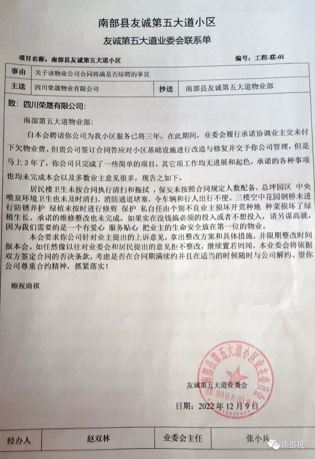 对于一直出现的问题,业委会多次函告物业公司,但改进无力度无起色。于是业委会与小区业主通过程序,决定重新对物业管理进行招标。
