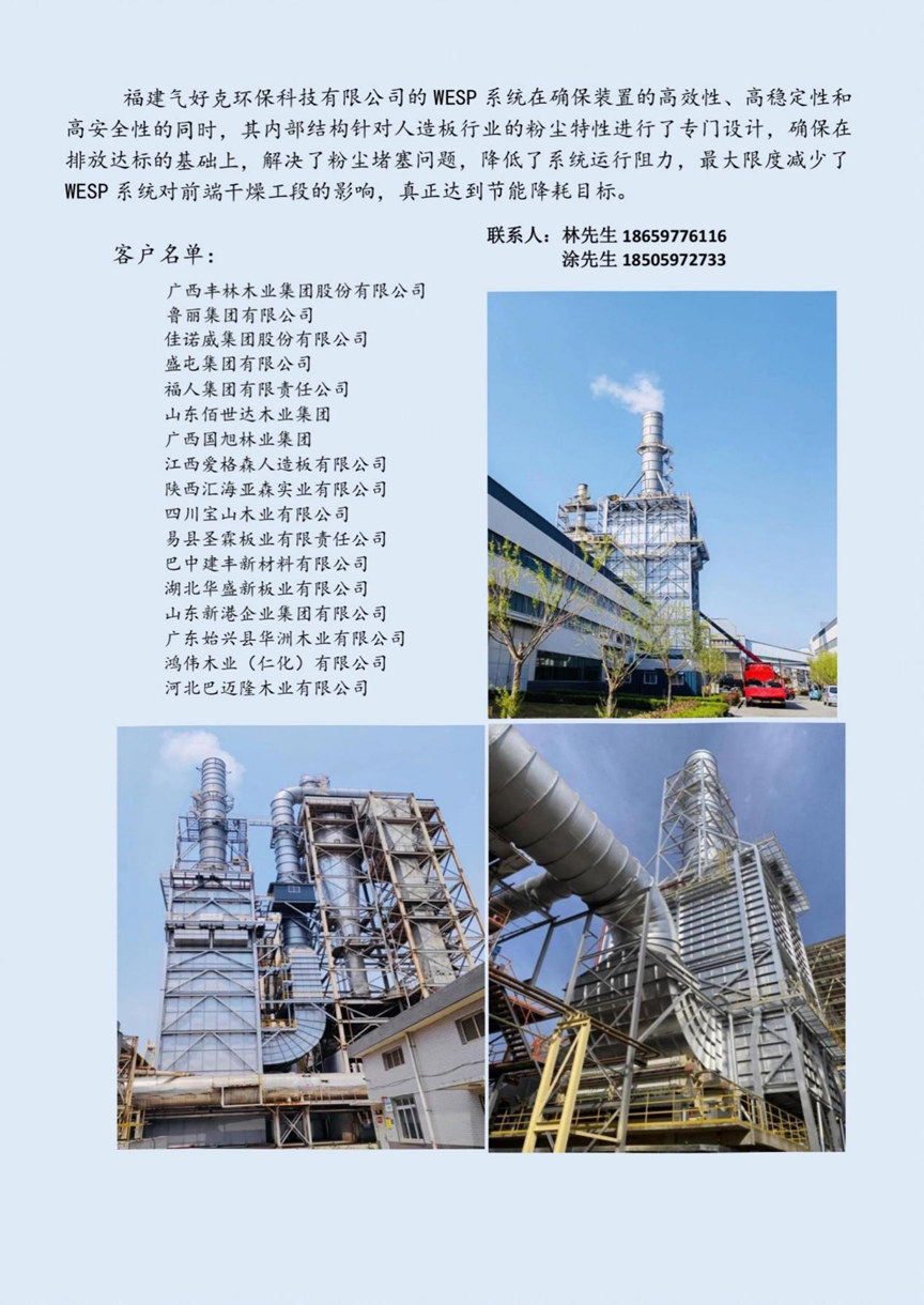 保定天泽林板业有限公司创办于2007年4月,企业荣获河北省林果产业重点龙头企业、河北省农业产业化重点龙头企业、河北省扶贫龙头企业;产品荣获河北省名牌产品、河北省优质产品、河北省中小企业名牌产品等荣誉称号。此次天泽林公司领导经多方考察交流,最终决定将项目交由气好克公司实施,充分体现了天泽林公司对环境保护工作的高度重视及对气好克公司的信任。该项目采用气好克公司“两级湿静电一体化”系统,处理后颗粒物浓度<5.0mg/Nm³,并且能有效降低VOCs排放值。气好克公司的“两级湿静电”系统已应用于超过十条人造板生产线上,并取得了良好的效果。“两级湿静电系统”对于干燥尾气颗粒物的排放具有更大的可控空间,同时对环保要求严格的企业在应对重污染天气限产停产能起到较大的帮助,为工厂生产的连续性提供助力。