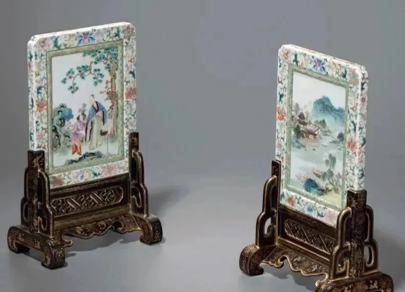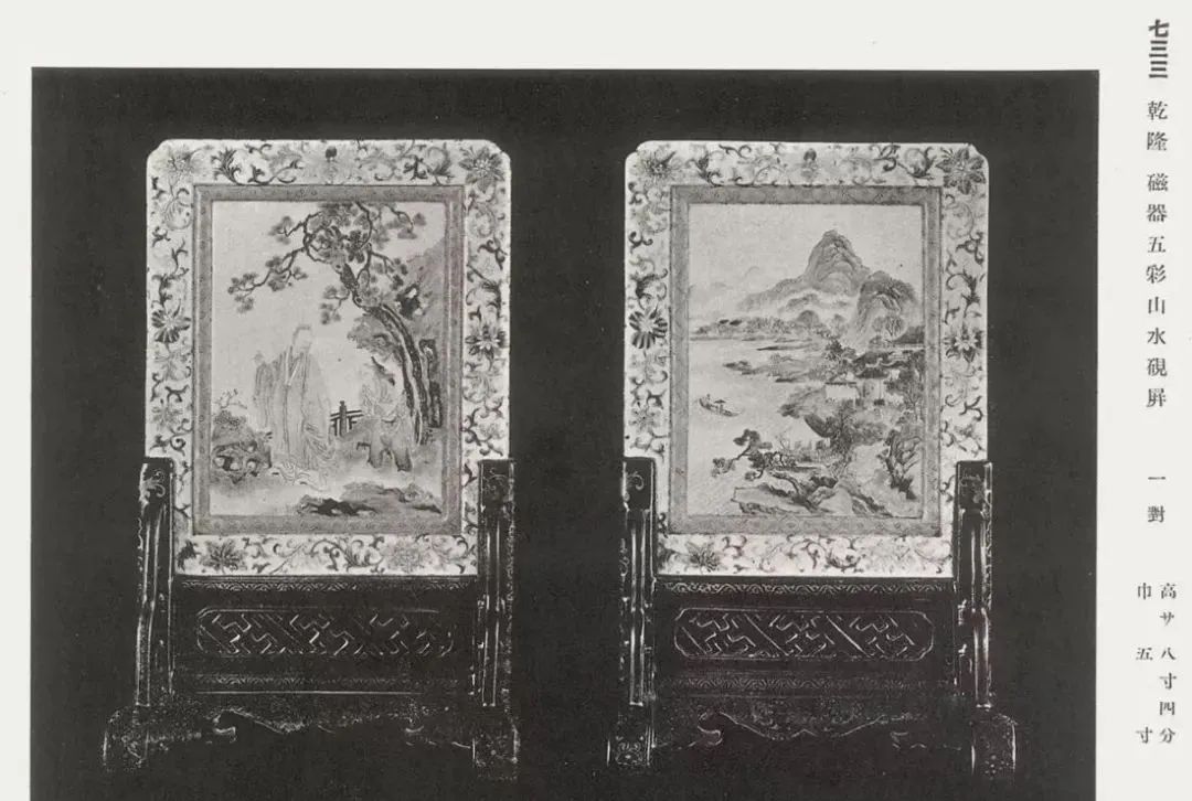 ▲ 图18 清乾隆 洋彩山水高士图砚屏一对 山中商会经手 《世界古美术展览会》 《中国工艺图鉴》 《名瓷我观》