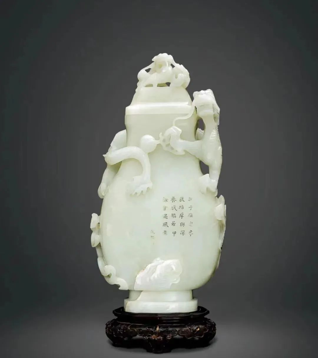 ▲图4 清乾隆 白玉刻御制诗苍龙教子盖瓶 来源:恭王府旧藏 山中商会