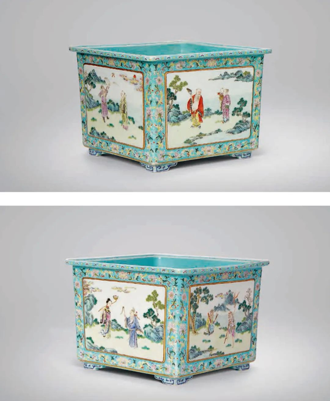 ▲图8 清道光 松石绿地粉彩八仙故事图四方花盆成对 来源:山中商会 《东西古美术展览会》,图679,1932年 此对花盆亦出现在新发现的近百幅山中商会委托山本照相馆所拍摄的器物照片中