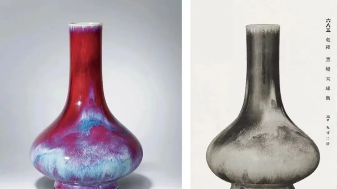 ▲ 图23 清乾隆 窑变釉火焰红瓶(左) 私人收藏 在《中国朝鲜古美术展观》图录(右)中被称为“乾隆 窑变天球瓶”