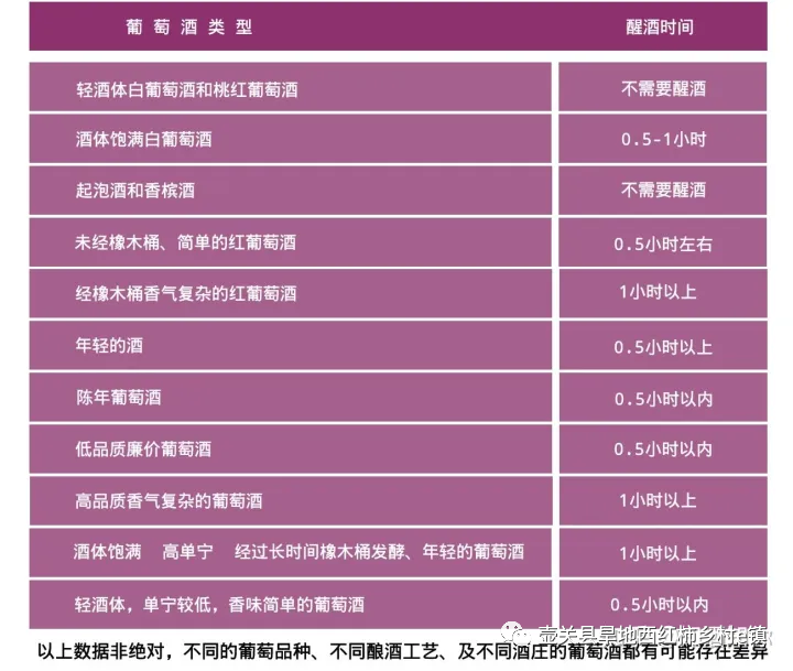 葡萄酒在酿造的过程中,一些葡萄酒为了进行保鲜,会添加二氧化硫作为抗氧化剂;还有长时间瓶中陈年的酒会出现一些沉淀物,同时瓶中陈年还会产生一些不良气味;这些都会极大的影响葡萄酒的口感。 1.醒酒能使尖锐粗糙的单宁与空气产生氧化反应,从而变得更加柔和;4.醒酒能激活沉睡的酒液,让密闭的香气重新散发出来。醒酒的作用:简单的说就是让葡萄酒更柔顺更好喝,同时排出一些有害健康或者影响口感的不良气味;搞清楚了醒酒的好处,那是不是所有的酒都需要醒呢?要醒多久?正确答案是:不是所有的酒都需要醒,不同类型的葡萄酒醒酒的时间也不同1.大部分酒体的白葡萄酒和桃红葡萄酒是不需要醒酒的,这些葡萄酒追求的是新鲜清爽的口感,适合年轻时饮用,过多接触氧气会使口感变得寡淡。2.气泡酒和香槟酒是不需要醒酒的,气泡酒一旦少了气泡,酒等于失去了灵魂;3.酒体相对轻盈的红葡萄酒醒酒时间较短,一般半小时左右即可;反之那些酒体饱满,高单宁的红葡萄酒醒酒时间要长,一般要1个小时以上;4.未经过橡木桶陈酿,简单的葡萄酒醒酒时间短;而经过橡木桶陈酿的,结构复杂的葡萄酒醒酒时间相对要长,橡木桶陈酿时间越长醒酒时间也要越长;5.年轻的酒,单宁一般较为粗糙相应醒酒的时间要长;至于陈年老酒,单宁在瓶中已熟化,醒酒只是为了去除酒中的杂质,因此通常短短几分钟的醒酒时间便已足够。如果过多地暴露在空气中,其仅存的微弱芳香会消散得更快。6. 廉价的地区餐酒一般结构简单,醒酒时间较短,有些酒甚至无须醒酒;而一些高品质、香气复杂的名庄酒则需长时间醒酒,一般需要醒酒1小时以上。总之 酒体饱满 高单宁 经过长时间橡木桶发酵、年轻的葡萄酒醒酒时间越长;而轻酒体,单宁较低,香味简单的葡萄酒醒酒时间相对较短;