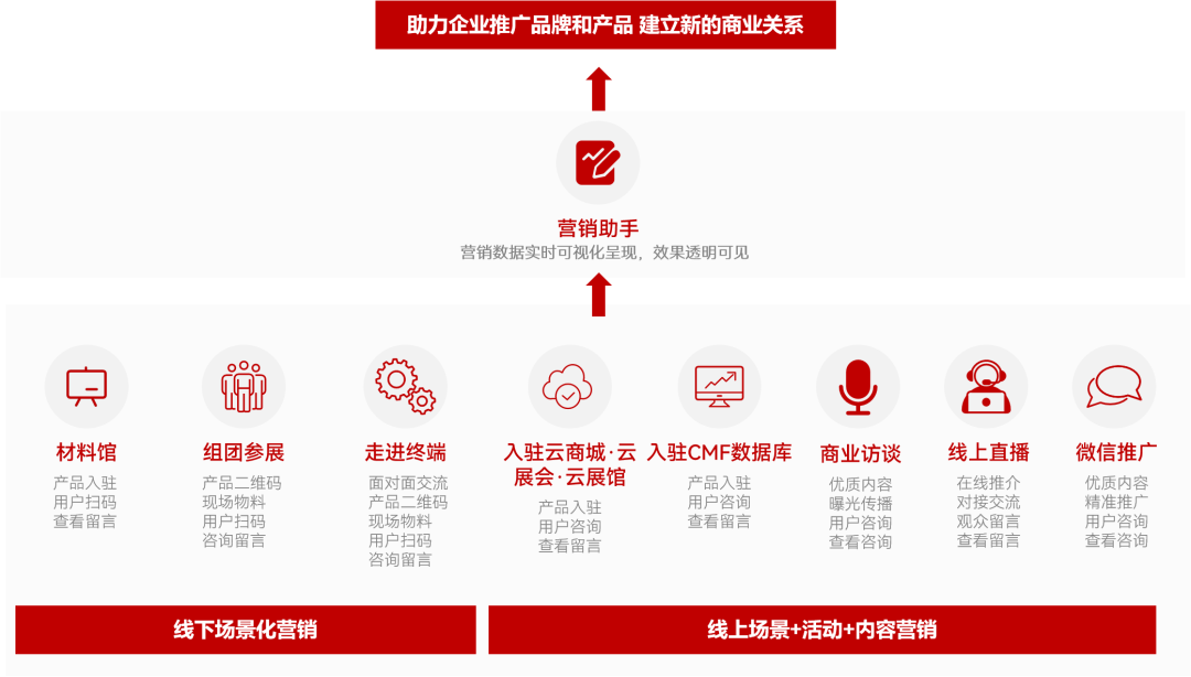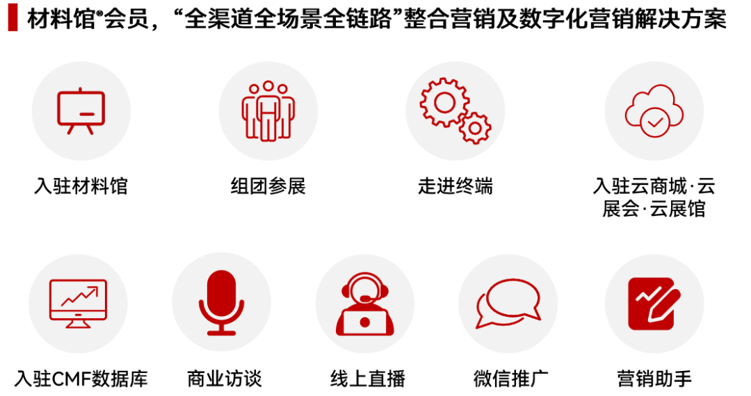会员单位通过在材料馆®、行业展会、走进终端、云展会·云商城·云展馆、CMF数据库展览展示,线上直播、商业访谈视频栏目、微信软文的曝光推广,获得的合作意向咨询将通过有材®营销助手,第一时间闭环反馈会员单位,提高会员单位经营决策效率。