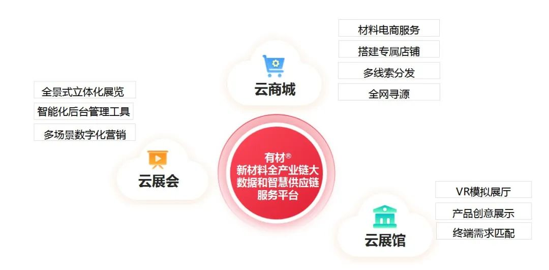 有材®云展会+云商城+云展馆组合营销模式,依托平台优势打通各链路之间壁垒,帮助会员单位整合多场景资源,沉淀用户资产,实现品牌塑造及销售转化的目标。