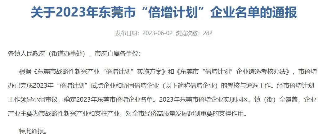 倍增企业:"倍增计划"是指东莞按照"选好选优、培优培强"的原则,通过选取一批优势企业进行重点培育,支持企业通过企业管理、技术研发、增资扩产、数字化转型、并购上市、总部经济、产业链整合等提升综合竞争力,力争用5年时间,推动试点企业实现规模和效益的倍增。