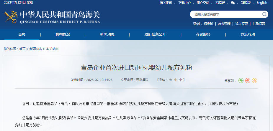 近日,达能特殊营养品(青岛)有限公司申报进口的一批重25.66吨的婴幼儿配方乳粉在青岛大港海关监管下顺利通关,并将很快投放市场。这是自今年2月份婴儿配方食品、较大婴儿配方食品、幼儿配方食品3项食品安全国家标准正式实施以来,青岛海关辖区首批入境的新国家标准婴幼儿配方乳粉。