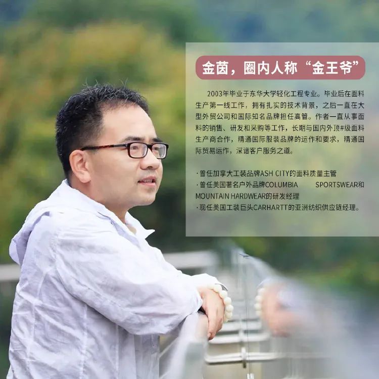 作者金茵。他毕业于东华大学,拥有扎实的实地就业和技术背景。曾在面料工厂的生产第一线工作,之后一直在大型外贸公司和国际知名品牌担任高管,包括担任加拿大知名工装品牌的面料质量主管、美国著名户外品牌的研发经理、现任美国某工装巨头的亚洲纺织供应链经理。