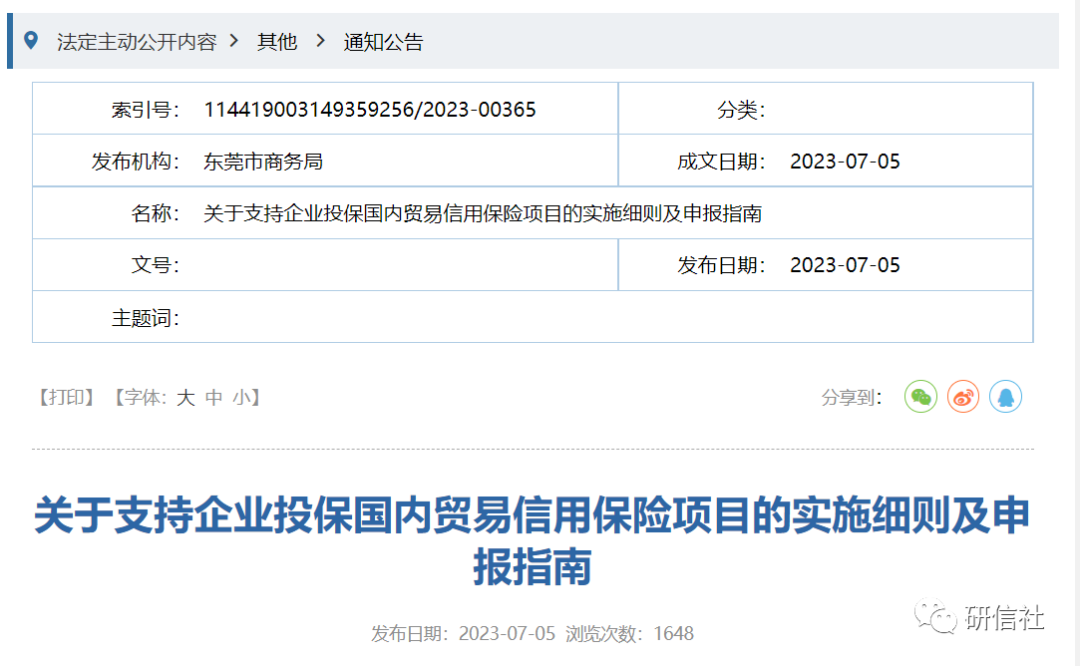 备注:以上政策解读仅代表研信社观点,具体实务中需参考东莞商务局的解读,建议如果想贴合该政策的企业可通过当地保险公司或者当地商务局确认具体政策实施情况。
