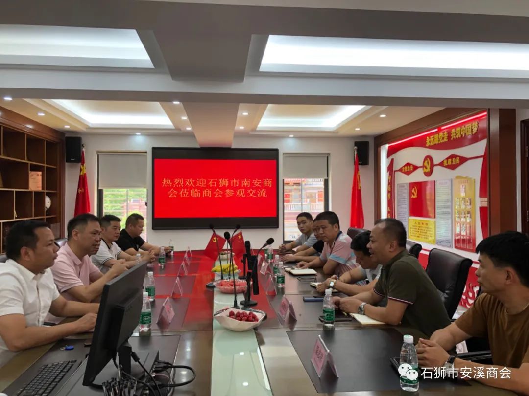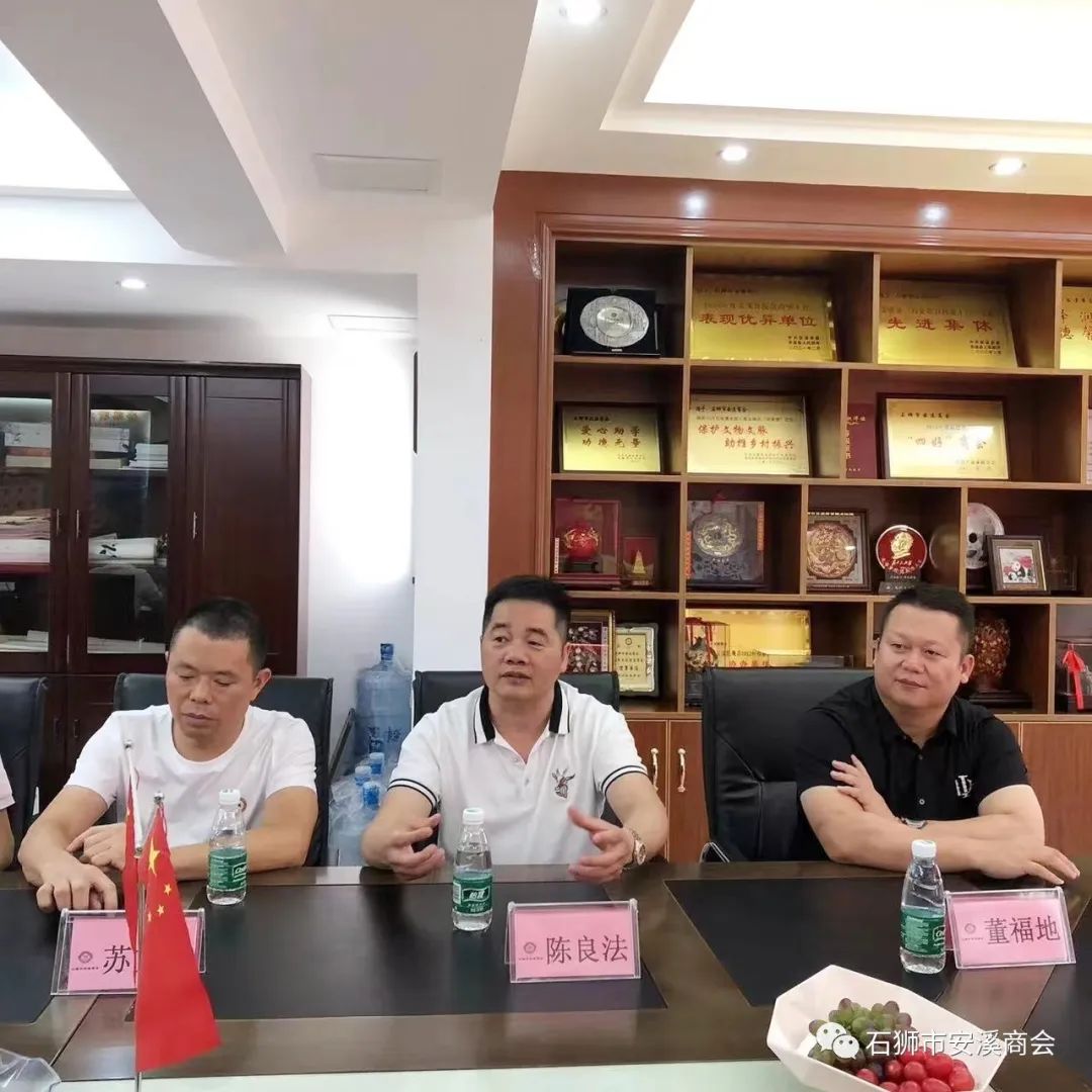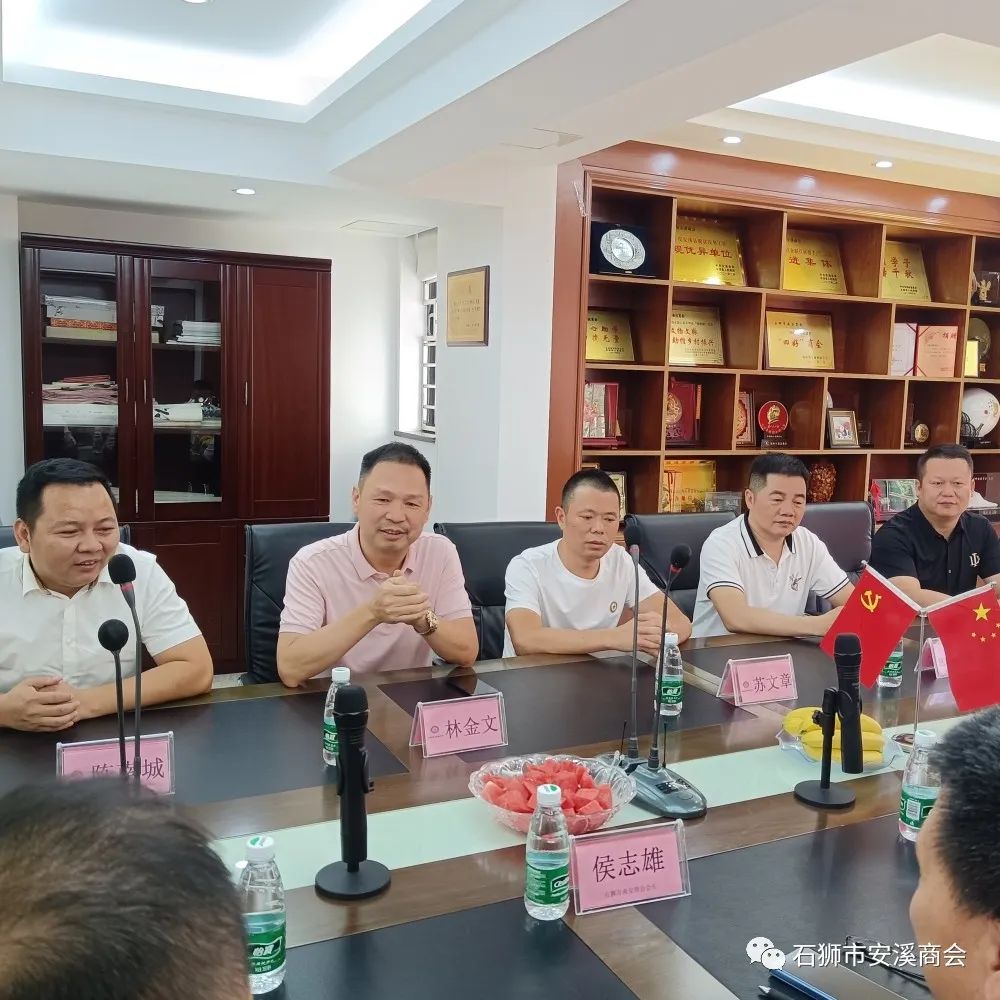为加强兄弟商会之间的交流互动,2023年7月24日下午,石狮市南安商会会长侯志雄,秘书长苏连生,常务副会长陈哲育、黄世龙,副秘书长梁志祥、叶涛远、候马飞等一行莅临石狮市安溪商会参观交流。我会会长林金文,执行会长苏文章、党支部书记董福地,监事长陈良法,常务副会长兼秘书长陈南城等热情接待来访的贵宾。