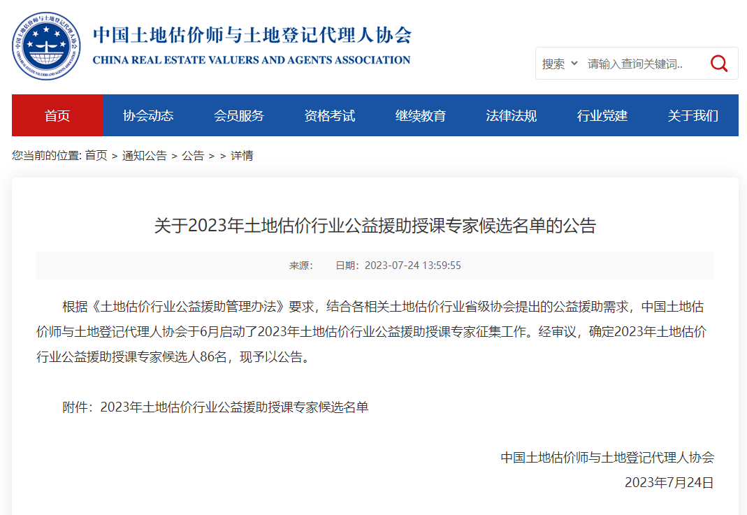 根据《土地估价行业公益援助管理办法》要求,结合各相关土地估价行业省级协会提出的公益援助需求,中国土地估价师与土地登记代理人协会于6月启动了2023年土地估价行业公益援助授课专家征集工作。经审议,确定2023年土地估价行业公益援助授课专家候选人86名。