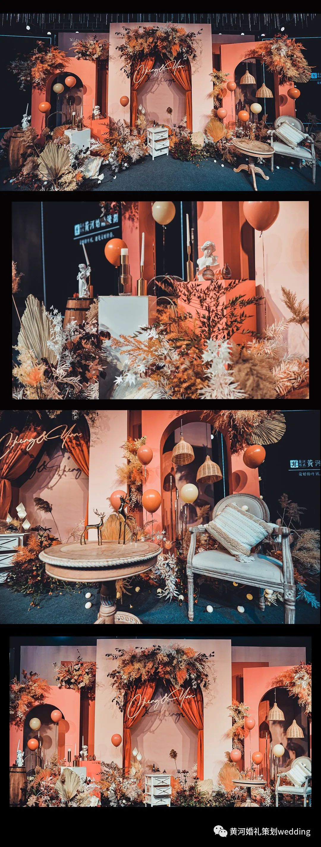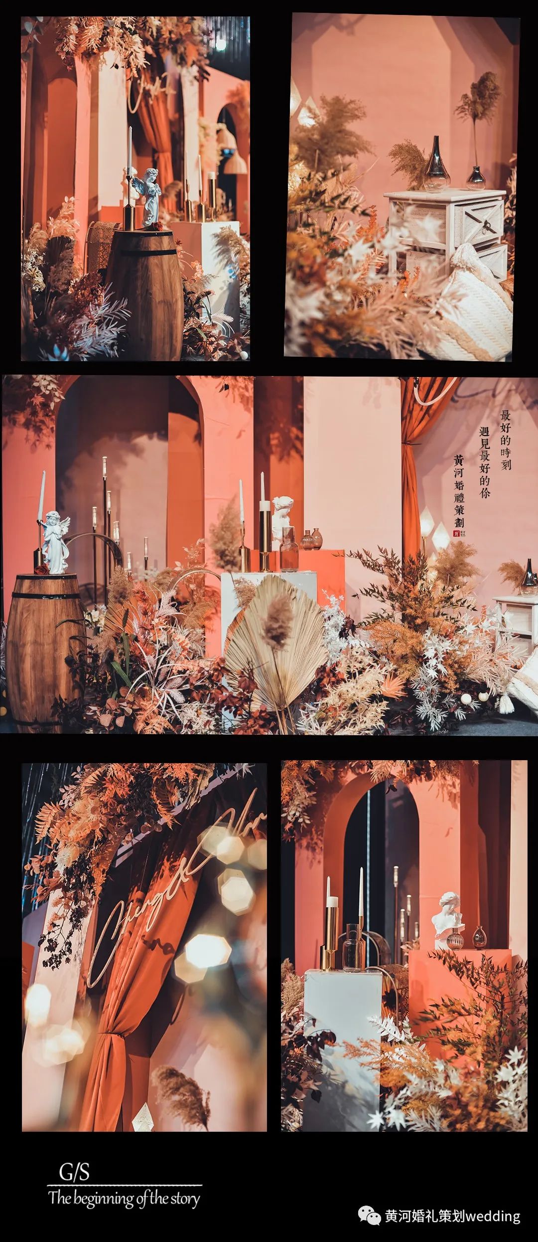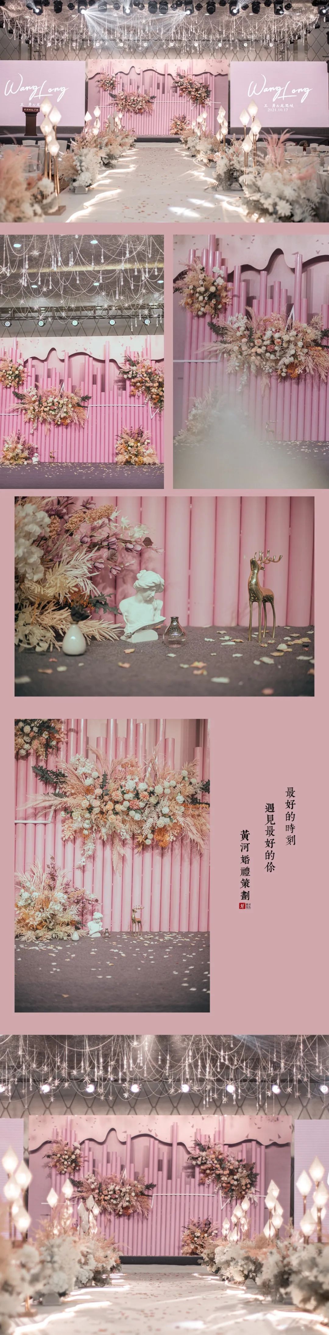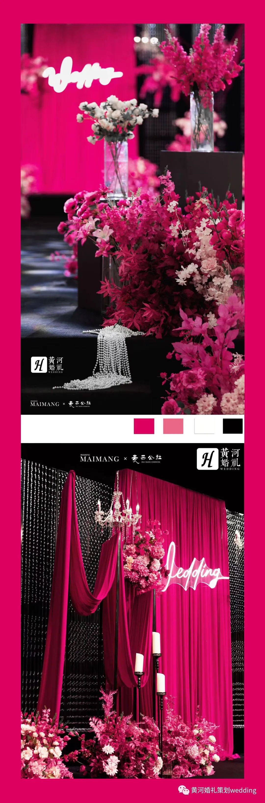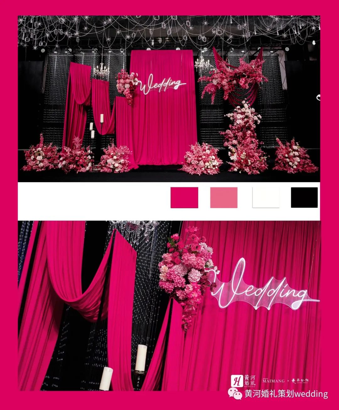 玫红色的布幔交织出幸福与爱情的韵味,水晶的点缀让婚礼更多了一抹大气之感。在黑色的底色下更加显眼且充满高级。