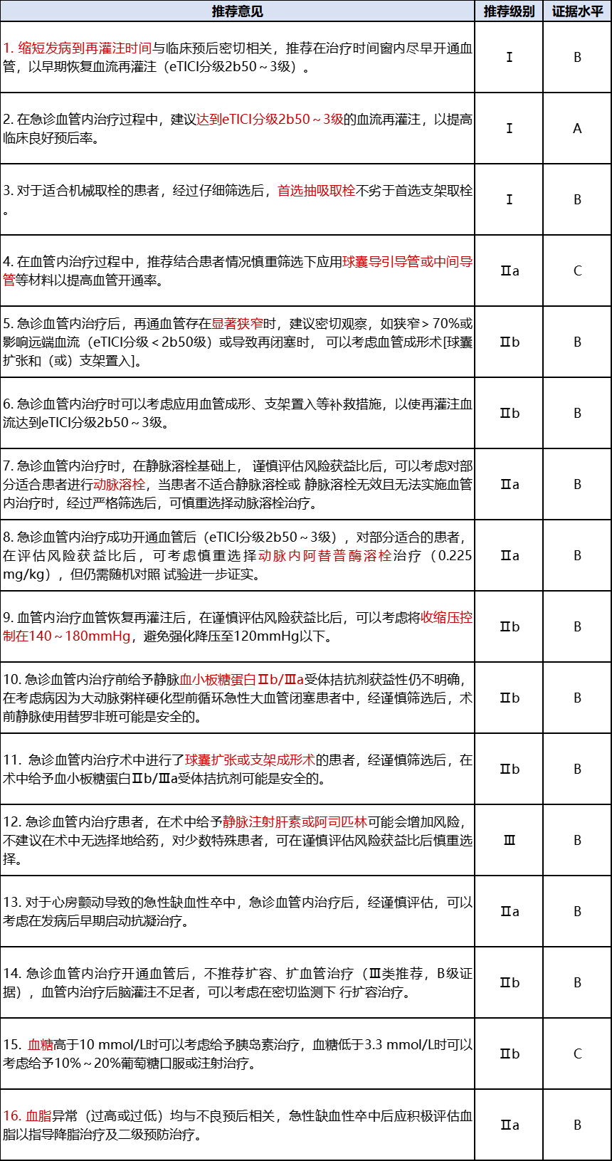 在患者选择方面,新指南围绕:血管内治疗的目标、麻醉方案、桥接治疗、时间窗、中等血管闭塞、基底动脉闭塞、颅内动脉闭塞合并原位狭窄以及前循环大梗死核心患者的血管内治疗方面,汇聚了14条的推荐意见。