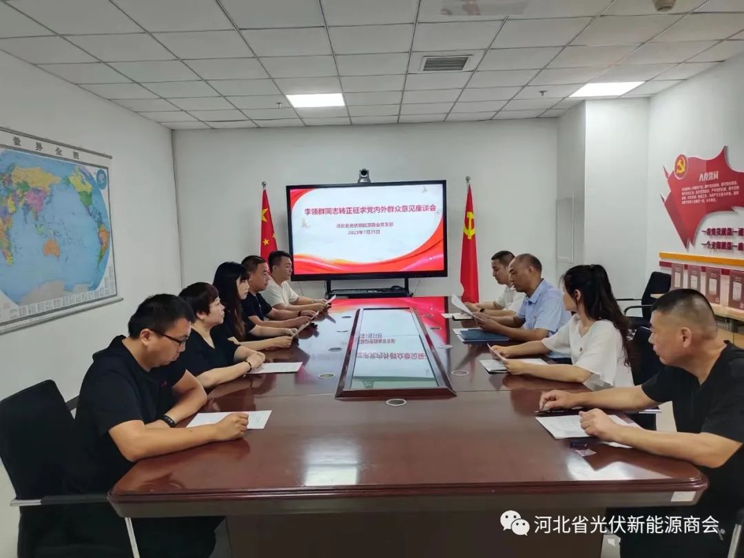 为进一步加强党员管理教育,增强党性觉悟,规范党员发展工作,2023年7月25日上午,河北省光伏新能源商会党支部在商会党员活动中心组织召开李领群同志转正征求党内外群众意见座谈会。预备党员李领群以及所在企业河北全民光伏科技有限公司党员代表王立超、孙继格、孙永明,群众代表范丽静、么世明、刘宁、崔巧玲总计9人参加。座谈会由商会党支部书记马献立主持。
