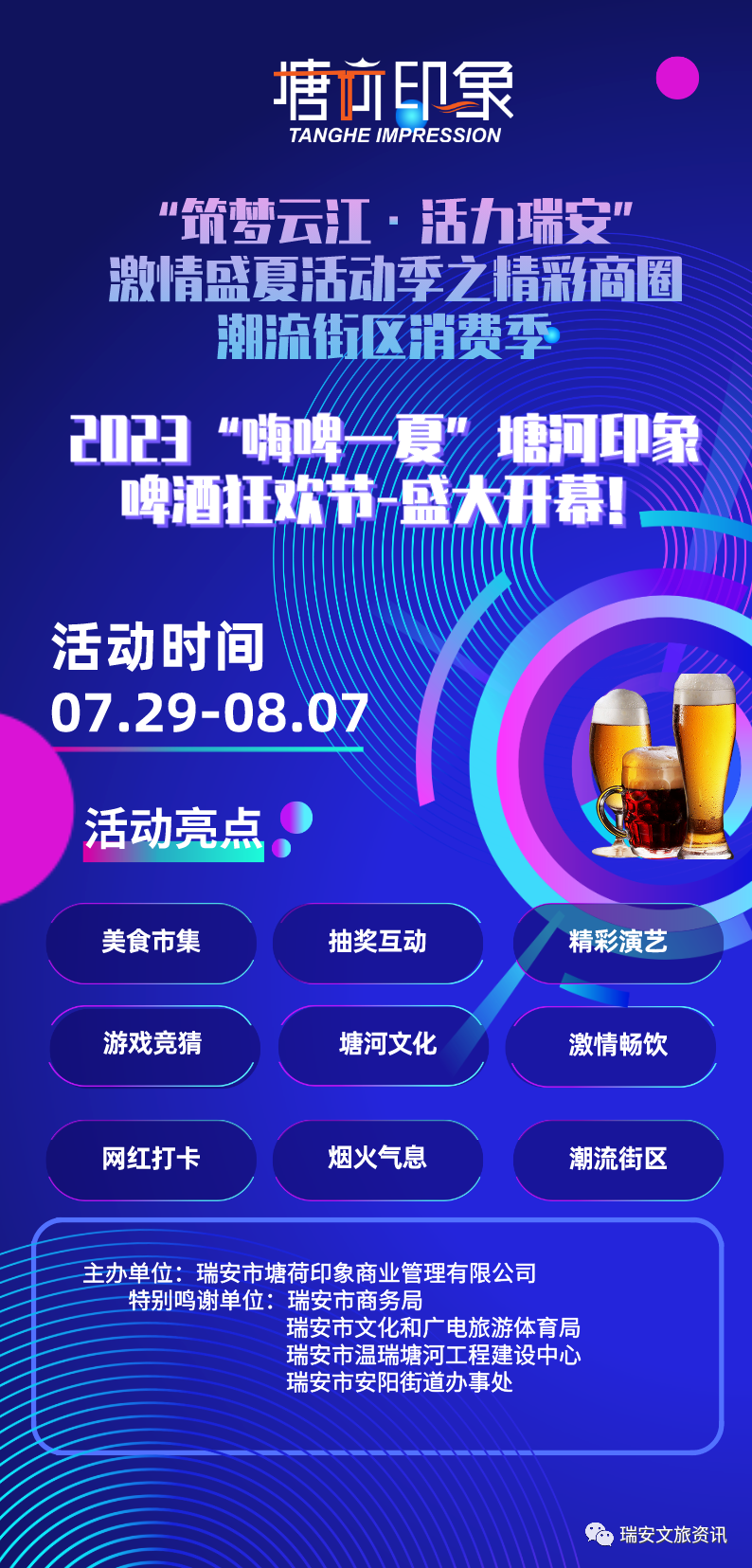 啤酒与美食搭配,极致的音乐享受,以啤酒节为主线贯穿,市民可亲临体验夏日的激情,以逛“潮流市集”形式,品尝瑞安当地特色美食及全国名小吃、欣赏精彩演艺、参与抽奖互动、网红直播打卡、塘河文化交流,感受六七十年代的市井气息。