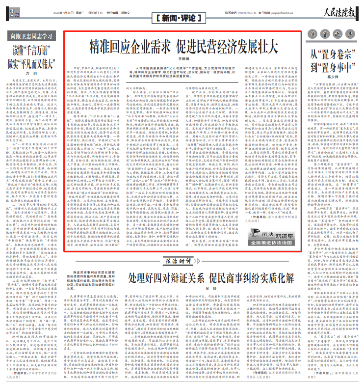 日前,中共中央、国务院印发《关于促进民营经济发展壮大的意见》,对促进民营经济发展提出8个方面31条举措。要让民营经济做大做优做强,需要健全对各类所有制经济平等保护的法治环境,为民营经济发展营造良好稳定的预期。因此,人民法院要紧紧围绕“公正与效率”工作主题,充分发挥司法职能作用,精准回应企业需求,助力打造市场化、法治化、国际化一流营商环境,以高质量司法服务护航民营经济高质量发展。