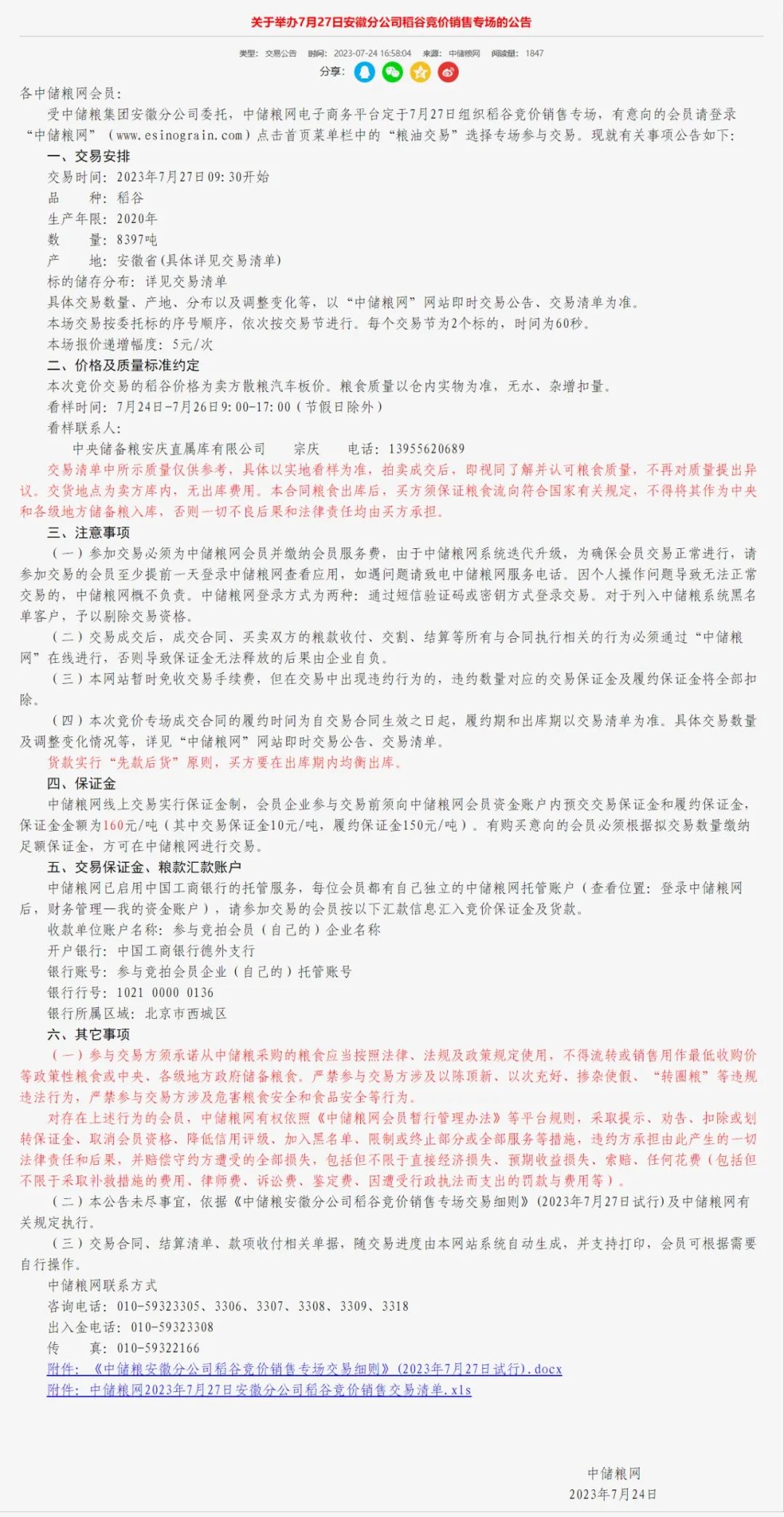关于举办7月27日安徽分公司稻谷竞价销售专场的公告