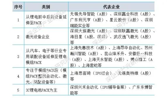 表1 我国动力及储能锂电模组PACK设备代表企业分类