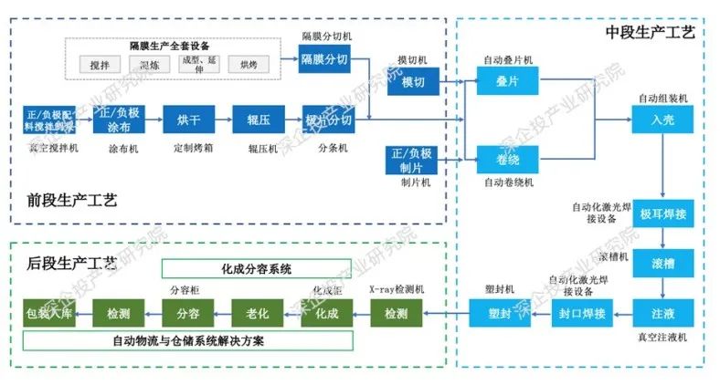 按照锂离子电池的制造流程,前段设备主要包括搅拌机、涂布机、辊压机、分条机、制片机和模切机等;中段设备主要包括卷绕机、叠片机、入壳机、注液机、封口焊接设备等;后段设备主要包括化成柜、分容柜等。锂电池主要生产工艺流程及对应设备如下图所示。