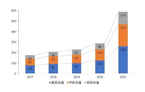 按设备类型来看,2021年我国锂电前段、中段、后段设备市场规模分别为259亿元、210亿元以及119亿元,占比分别为44.05%、35.71%、20.24%,如下图所示。