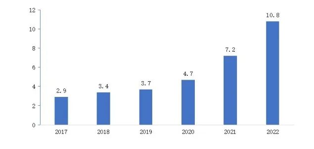 包蓝膜机处于锂电池制造后段工序环节,主要用于锂电池电芯外表贴绝缘膜、底部与顶部折边、贴绝缘片、尺寸测量、绝缘性测量等。GGII数据显示,2022年全球包蓝膜设备的市场规模为15亿元,其中国内包膜设备的市场规模为10.8亿元,同比增长50%,如下图所示。