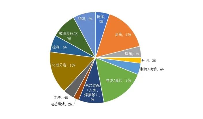 锂电池关键设备主要集中于前段和中段,价值量占比共计达到70%左右(不计入模组及PACK设备,如计入则为60%左右)。根据中信建投报告,综合电芯制造、模组及PACK生产设备,从各工艺环节设备价值量看,搅拌占5%、涂布占16%、辊压占4%、分切占2%、制片/模切占4%、卷绕/叠片占16%、电芯装配(入壳、焊接等)占9%、电芯烘烤占2%、注液占4%、化成分容占15%、检测占6%、模组及PACK占9%、物流占8%,如下图所示。