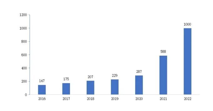 伴随国内锂电池尤其是动力电池企业扩产加速,我国锂电设备市场规模持续高速增长。根据GGII调研统计,2022年中国锂电生产设备(仅针对电芯生产环节中使用的设备)市场规模达1000亿元,同比增长70.1%。2016年至2022年我国锂电设备市场规模如下图所示。东吴证券预计2025年全球锂电设备新增市场需求超过1800亿元。