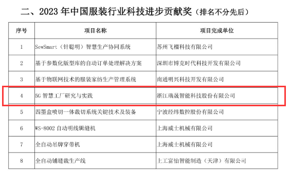 立足自身专利技术,服务客户需求。瑞晟智能以已经落地的服装智能智造一体化工厂项目为实际蓝本,总结提交的“5G智慧工厂研究与实践”项目被授予“2023年中国服装行业科技进步贡献奖”。此次获奖再次证实了公司在该领域上的卓越表现,也是对公司在纺织服装智能制造上的技术创新和可持续发展方向上努力的一个认可。