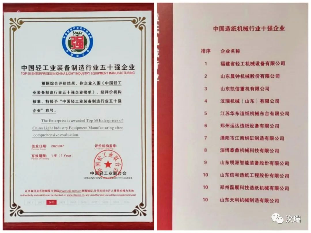 喜报 汶瑞机械荣获中国轻工业联合会统计评价的2022年度“中国轻工业装备制造行业50强企业”&“中国造纸机械行业10强企业”荣誉称号