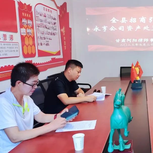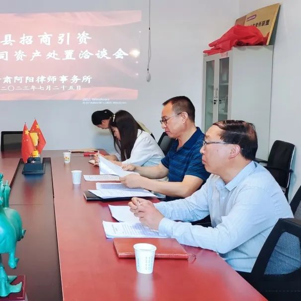 2023年7月25日下午,全县招商引资永亨公司资产处置洽谈会在甘肃阿阳律师事务所召开,仁大镇政府党委书记尹婉琴、贵州首杨企业管理有限公司董事长杨波一行、甘肃阿阳律师事务所(破产清算管理人)参加,会议顺利召开。