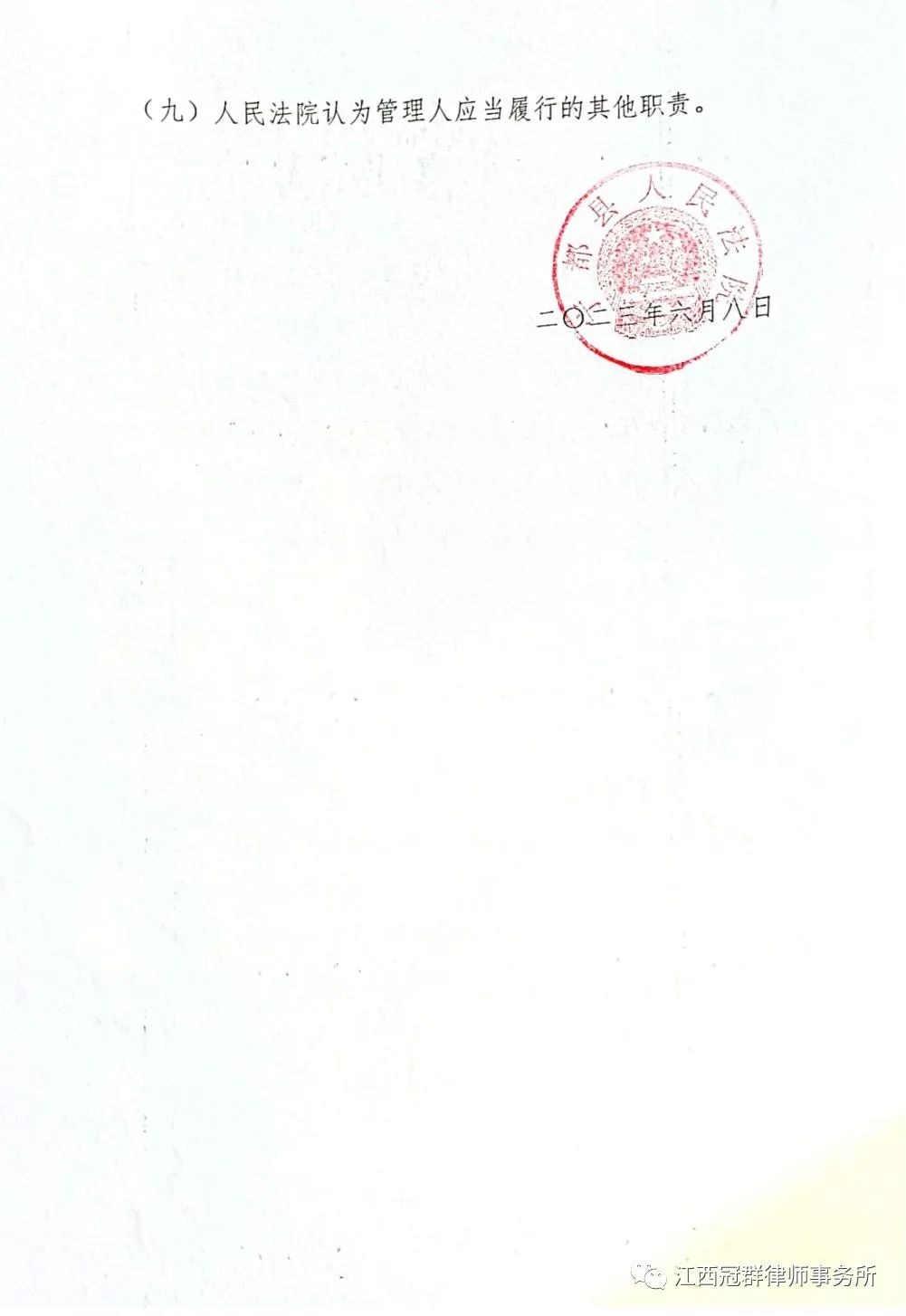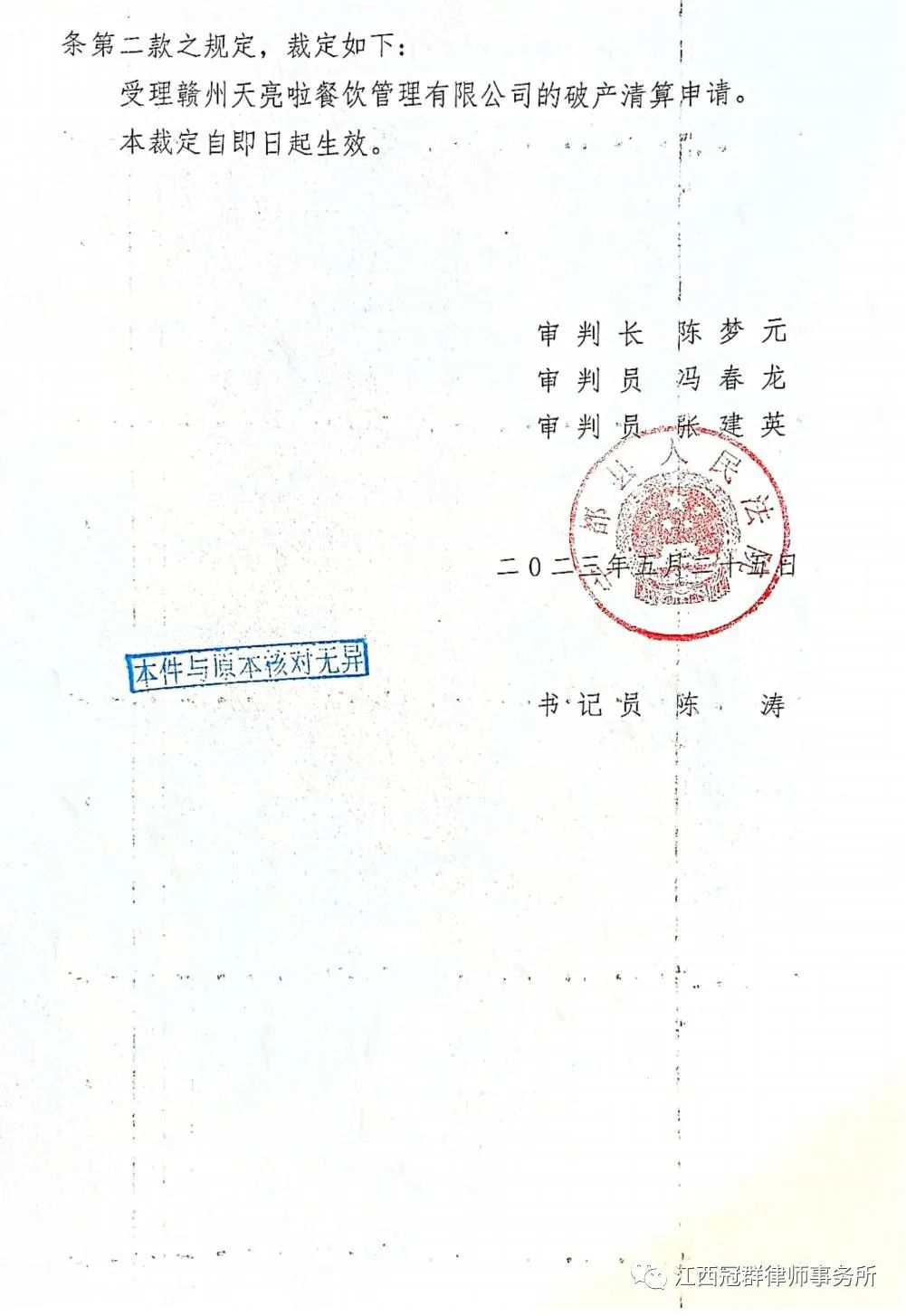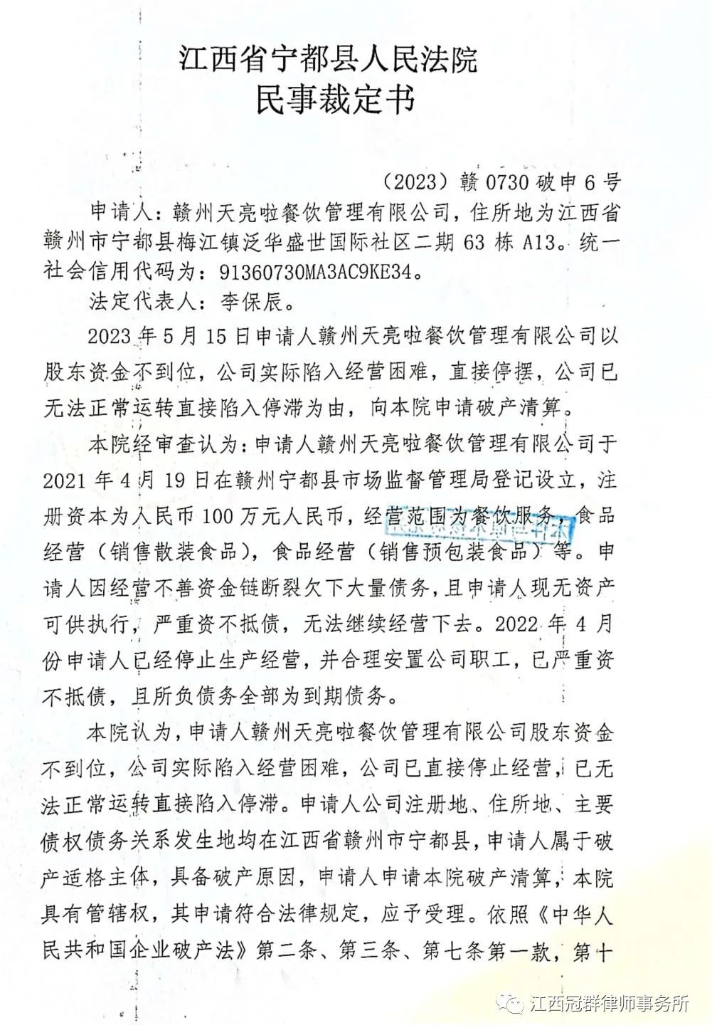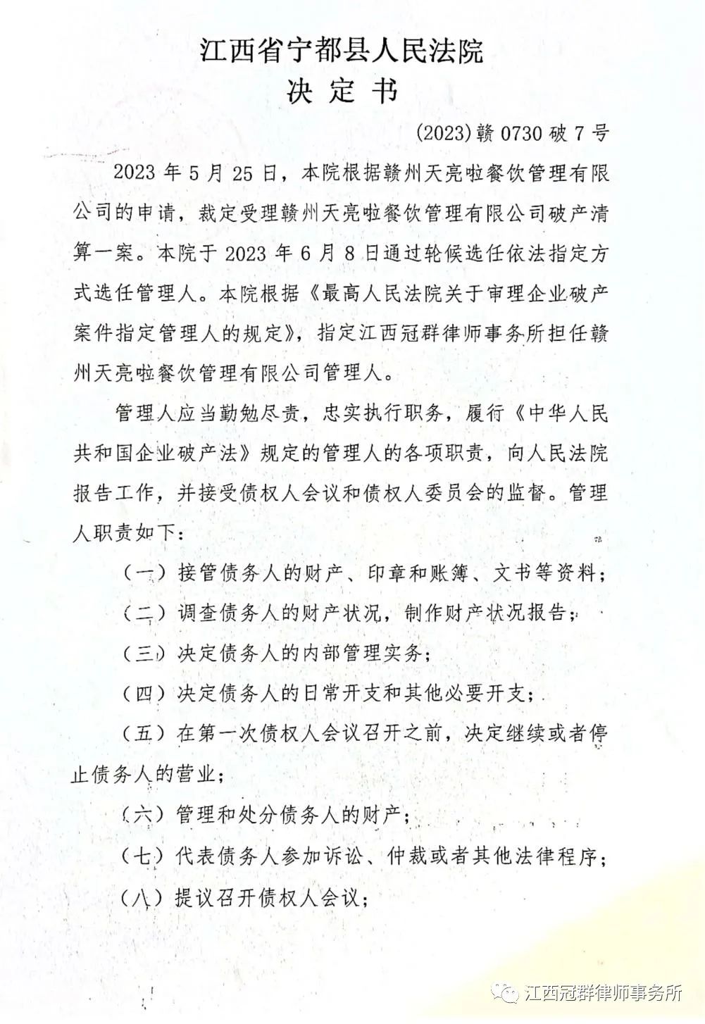 江西省宁都县人民法院于2023年5月25日作出(2023)赣0730破申6号民事裁定书,裁定受理了债务人赣州天亮啦餐饮管理有限公司(以下简称“债务人”)破产清算案件,并在2023年6月8日作出(2023)赣0733破7号决定书,指定江西冠群律师事务所为管理人。