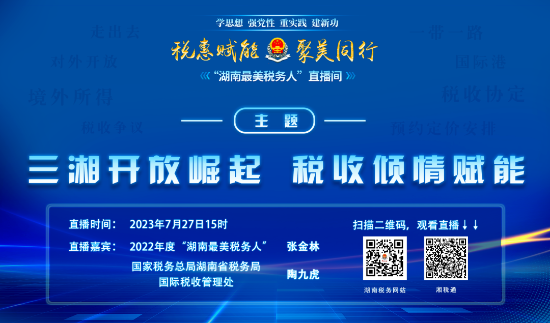 7月27日15点,“湖南最美税务人”张金林携手国家税务总局湖南省税务局国际税收管理处陶九虎走进直播间,为您详细解读税收服务“走出去”企业相关内容。